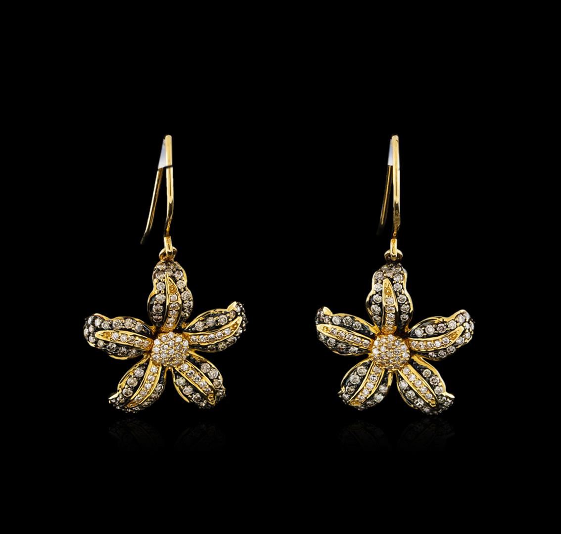 One pair electronically tested 14KT yellow gold ladies cast & assembled diamond flower earrings with French hooks. Each earring features a dangling diamond encrusted flower reminiscent of a Lily. Bright and anodized finish. Trademark is BH. Identified with markings of "14K". Condition is new, good workmanship. Containing: One Hundred Thirty prong set round brilliant cut diamonds, measuring 1.20 - 0.80 x 0.60mm (depth est.) approximate total weight of 130 Stones = 0.49ct. Color grade is an average for the group. Graded in the setting. Clarity: SI-1 to SI-2 Eighty-Eight prong set single cut diamonds, measuring 0.90 - 0.80 x 0.51mm (depth est.) approximate total weight of 88 Stones = 0.20ct. Graded in the setting. Clarity: VS-2 to SI-2. Color: G - H. Total Weight of Diamonds 0.69ct. Total Weight of Earrings 5.08gm. AIG Appraised at $3,705.00.