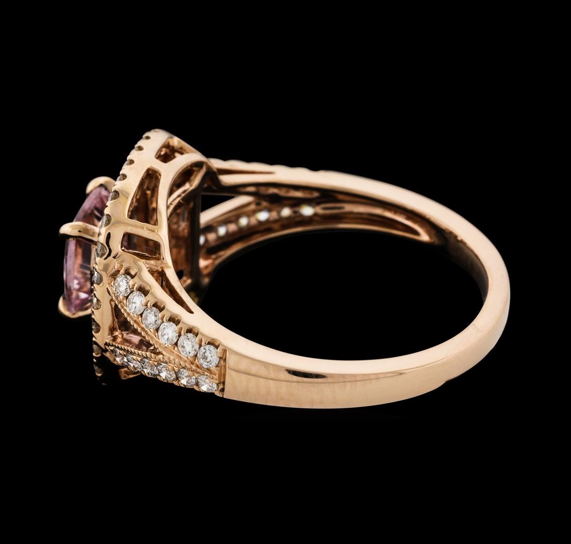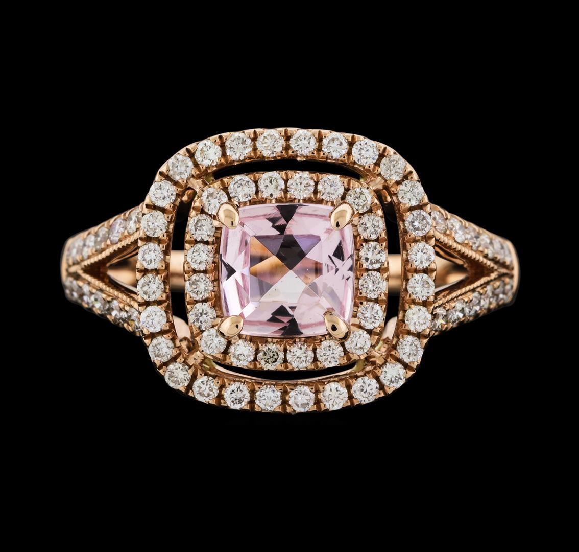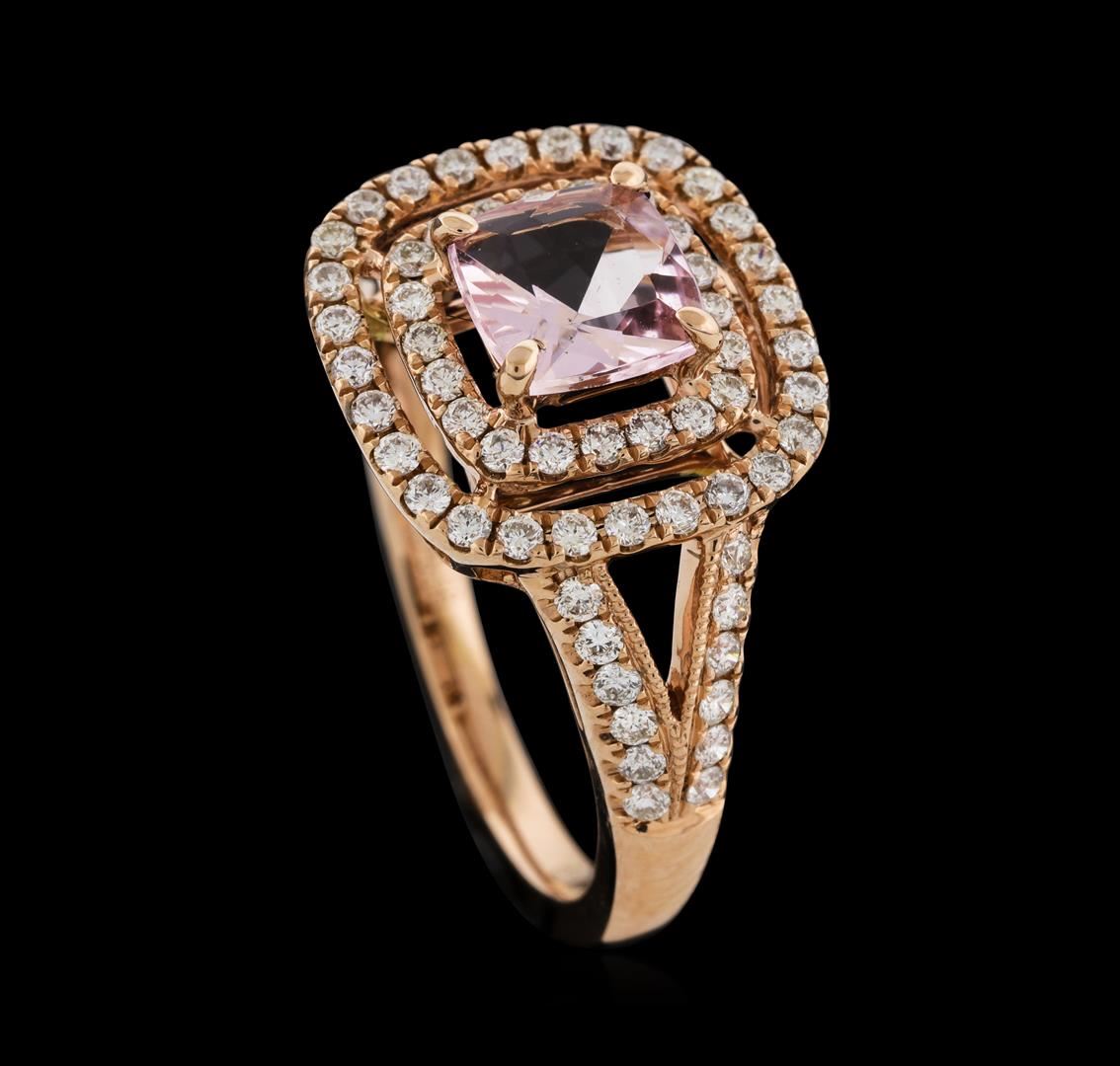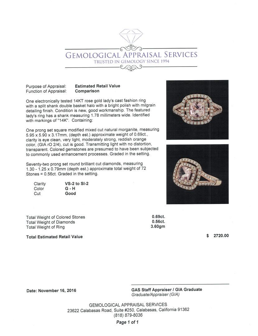 One electronically tested 14KT rose gold lady's cast fashion ring with a split shank double basket halo with a bright polish with milgrain detailing finish. The featured lady's ring has a shank measuring 1.78 millimeters wide. Identified with markings of '14K'. Condition is new, good workmanship. Containing: One prong set square modified mixed cut natural morganite, measuring 5.95 x 5.90 x 3.17mm, (depth est.) approximate weight of 0.69ct., clarity is eye clean, very light, moderately strong, reddish orange color, (GIA rO 2/4), cut is good. Transmitting light with no distortion, transparent. Colored gemstones are presumed to have been subjected to commonly used enhancement processes. Graded in the setting. Seventy-Two prong set round brilliant cut diamonds, measuring 1.30 - 1.25 x 0.79mm (depth est.) approximate total weight of 72 Stones = 0.56ct. Graded in the setting. Clarity VS-2 to SI-2. Color: G - H Cut Good. Total Weight of Colored Stones 0.69ct.. Total Weight of Diamonds 0.56ct.. Total Weight of Ring 3.60gm. GAS Appraised at $2,720.00.
