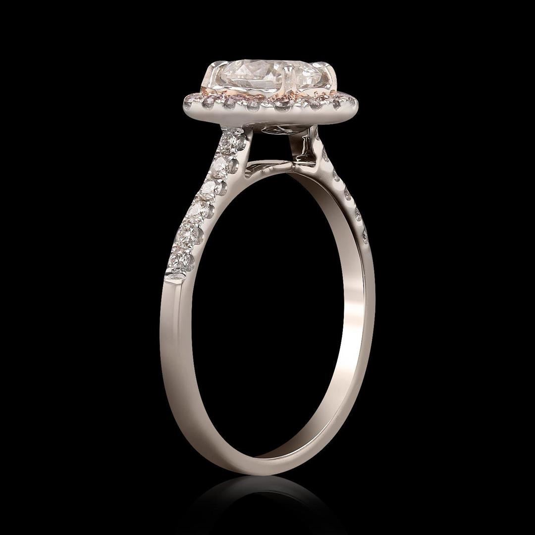 One electronically tested 18KT white gold ladies cast diamond unity ring. Condition is new, good workmanship. The featured diamond is set within a light pink diamond bezel, supported by diamond set shoulders, completed by a one and one half millimeter wid