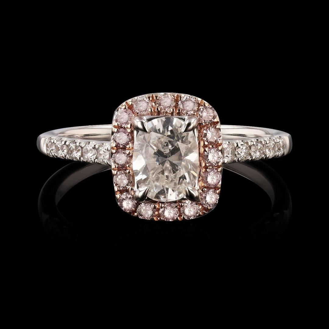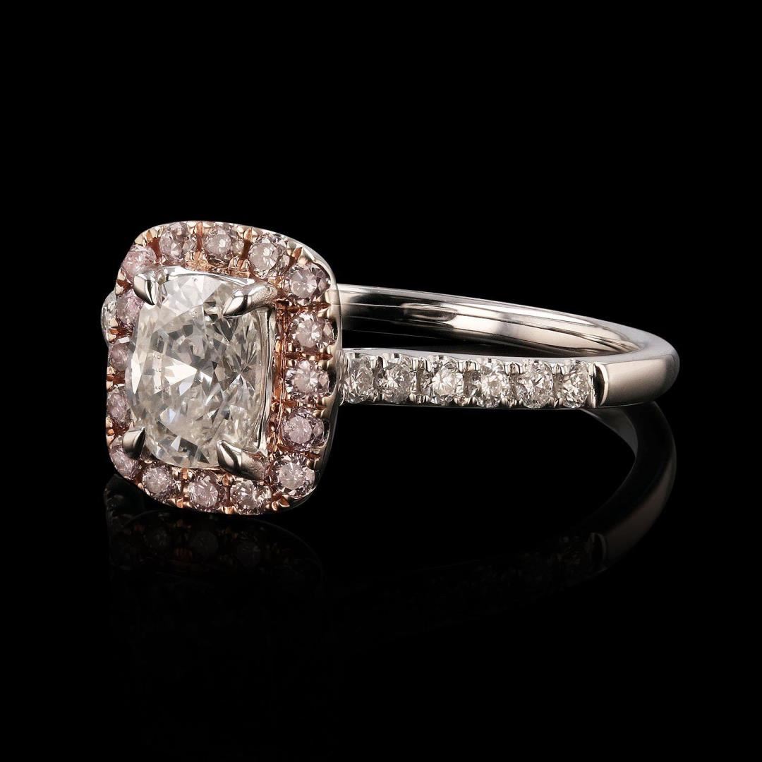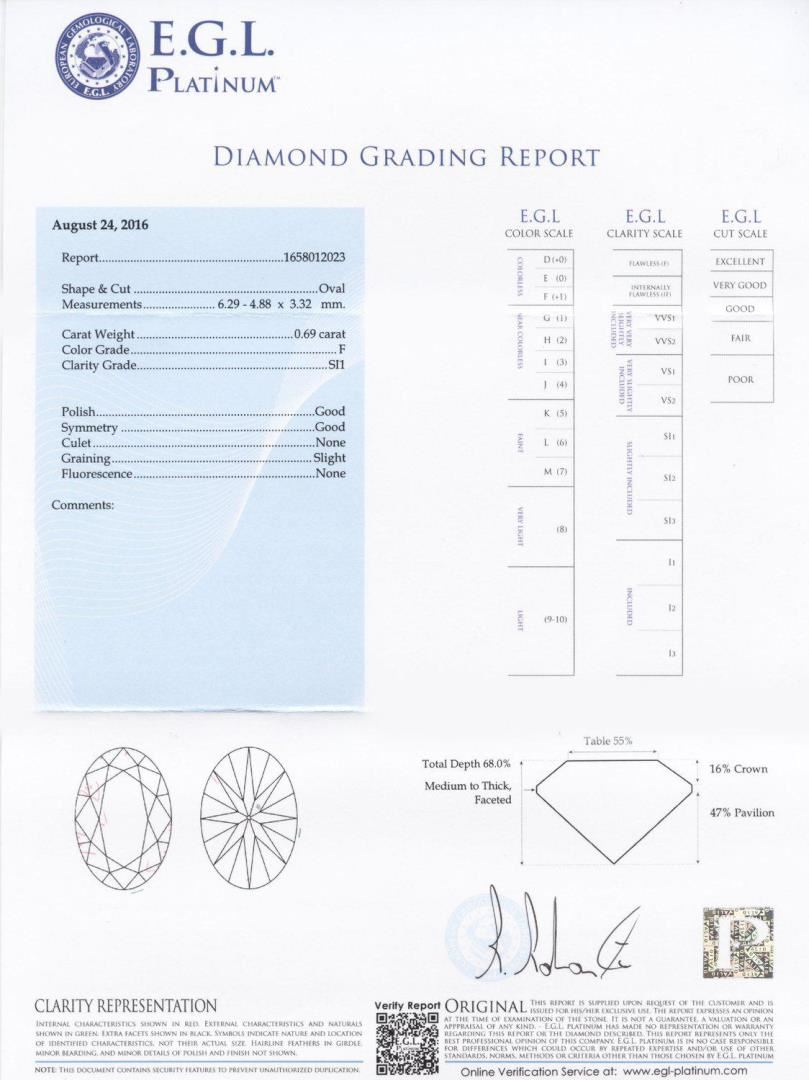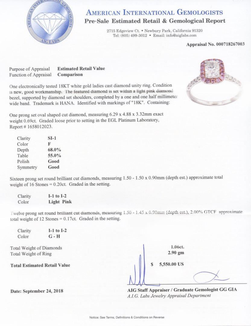One electronically tested 18KT white gold ladies cast diamond unity ring. Condition is new, good workmanship. The featured diamond is set within a light pink diamond bezel, supported by diamond set shoulders, completed by a one and one half millimeter wide band. Trademark is HANA. Identified with markings of "18K". Containing: One prong set oval shaped cut diamond, measuring 6.29 x 4.88 x 3.32mm exact weight 0.69ct. Graded loose prior to setting in the EGL Platinum Laboratory, Report # 1658012023. Clarity SI-1 Color F Depth 68.0% Table 55.0% Polish Good Symmetry Good Sixteen prong set round brilliant cut diamonds, measuring 1.50 - 1.50 x 0.90mm (depth est.) approximate total weight of 16 Stones = 0.20ctw. Graded in the setting. Clarity I-1 to I-2 Color Light Pink Twelve prong set round brilliant cut diamonds, measuring 1.50 - 1.45 x 0.90mm (depth est.), 2.00% GTCF approximate total weight of 12 Stones = 0.17ctw. Graded in the setting. Clarity I-1 to I-2 Color G - H Total Weight of Diamonds 1.06ctw. Total Weight of Ring 2.90 gm Size: 7