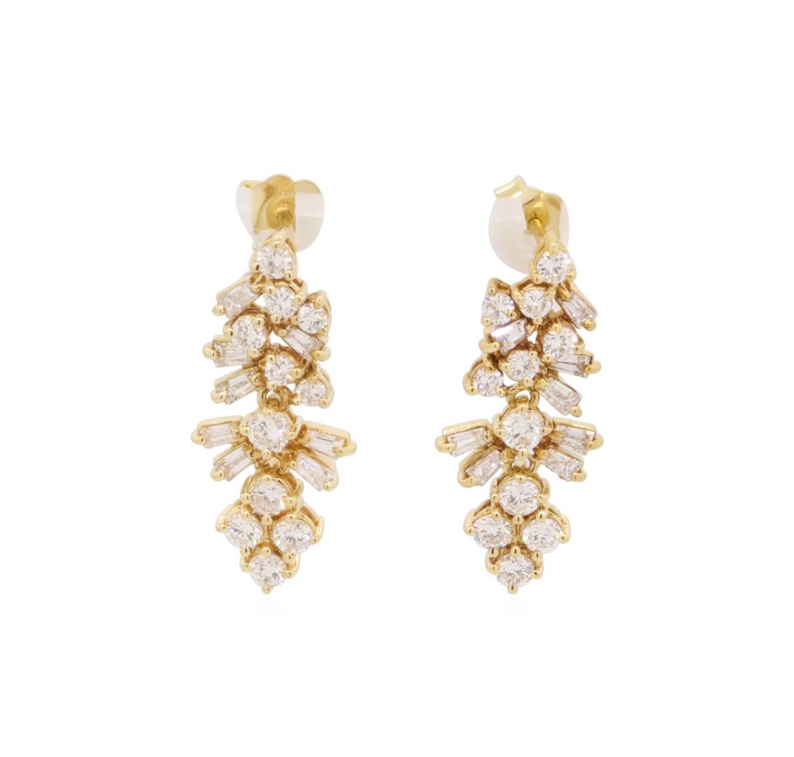 One pair electronically tested 18KT yellow gold lady's combination cast & assembled fashion waterfall dangle earrings with friction posts with a bright polish finish. The featured lady's earrings have a drop of approximately 24 millimeters. Identified with markings of '18K'. Condition is new, good workmanship. Containing: Ten prong set round brilliant cut diamonds, measuring 2.70 - 2.60 x 1.64mm (depth est.) approximate total weight of 10 Stones = 0.70ct. Graded in the setting. Color H - I Clarity VS-1 to VS-2 Cut Very Good Twelve prong set round brilliant cut diamonds, measuring 2.20 - 2.00 x 1.30mm (depth est.) approximate total weight of 12 Stones = 0.45ct. Graded in the setting. Color H - I Clarity VS-1 to VS-2 Cut Very Good Sixteen prong set baguette cut diamonds, measuring from 2.35 x 1.30 x 1.11mm (depth est.) to 2.50 x 1.60 x 1.36mm (depth est.) approximate total weight of 16 Stones = 0.65ct. Graded in the setting. Color H - I Clarity VS-2 to SI-1 Cut Very Good. Total Weight of Diamonds 1.80ct.. Total Weight of Earrings 4.20gm GAS Appraised at $4445.00. GAS Appraised.