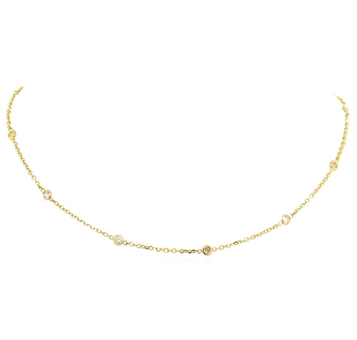 One electronically tested 14KT yellow gold lady's combination cast & assembled fashion necklace with a lobster claw clasp with a bright polish finish. The featured lady's necklace measures sixteen inches in length. Identified with markings of '14K'. Condition is new, good workmanship. Containing: Ten bezel set round brilliant cut diamonds, measuring 2.70 - 2.60 x 1.64mm (depth est.) approximate total weight of 10 Stones = 0.70ct. Graded in the setting. Color H - I Clarity SI-1 to SI-2 Cut Very Good. Total Weight of Diamonds 0.70ct.. Total Weight of Necklace 4.10gm GAS Appraised at $2300.00. GAS Appraised.