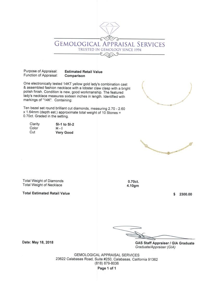 One electronically tested 14KT yellow gold lady's combination cast & assembled fashion necklace with a lobster claw clasp with a bright polish finish. The featured lady's necklace measures sixteen inches in length. Identified with markings of '14K'. Condition is new, good workmanship. Containing: Ten bezel set round brilliant cut diamonds, measuring 2.70 - 2.60 x 1.64mm (depth est.) approximate total weight of 10 Stones = 0.70ct. Graded in the setting. Color H - I Clarity SI-1 to SI-2 Cut Very Good. Total Weight of Diamonds 0.70ct.. Total Weight of Necklace 4.10gm GAS Appraised at $2300.00. GAS Appraised.