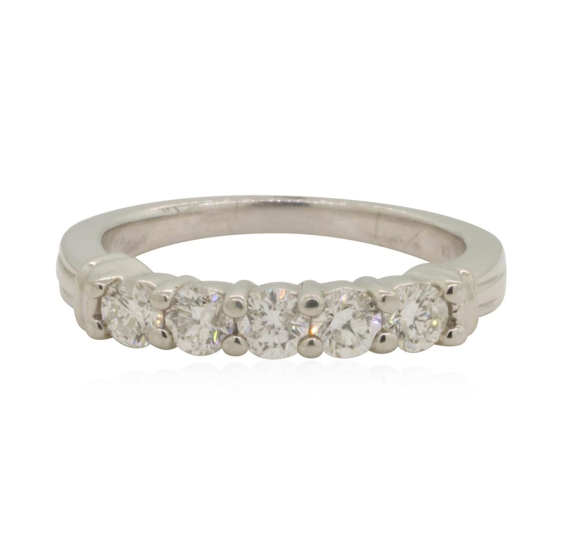 One electronically tested platinum lady's cast wedding ring with a five stone motif with a bright polish finish. This featured lady's ring has a shank measuring 1.95 millimeters in width. Trademark is ZEI. Identified with markings of 'PT'. Condition is like new, good workmanship. Containing: Five prong set round brilliant cut diamonds, measuring 3.35 - 3.30 x 2.06mm (depth est.) approximate total weight of 5 Stones = 0.70ct. Graded in the setting. Color H - I Clarity SI-3 to I-1 Cut Good. Total Weight of Diamonds 0.70ct.. Total Weight of Ring 6.40gm GAS Appraised at $2280.00. GAS Appraised.