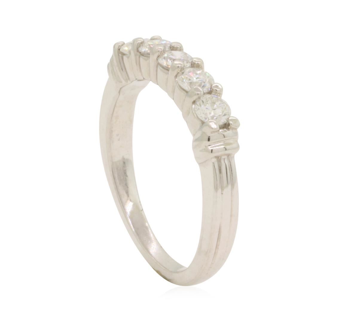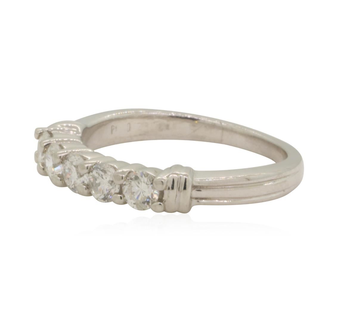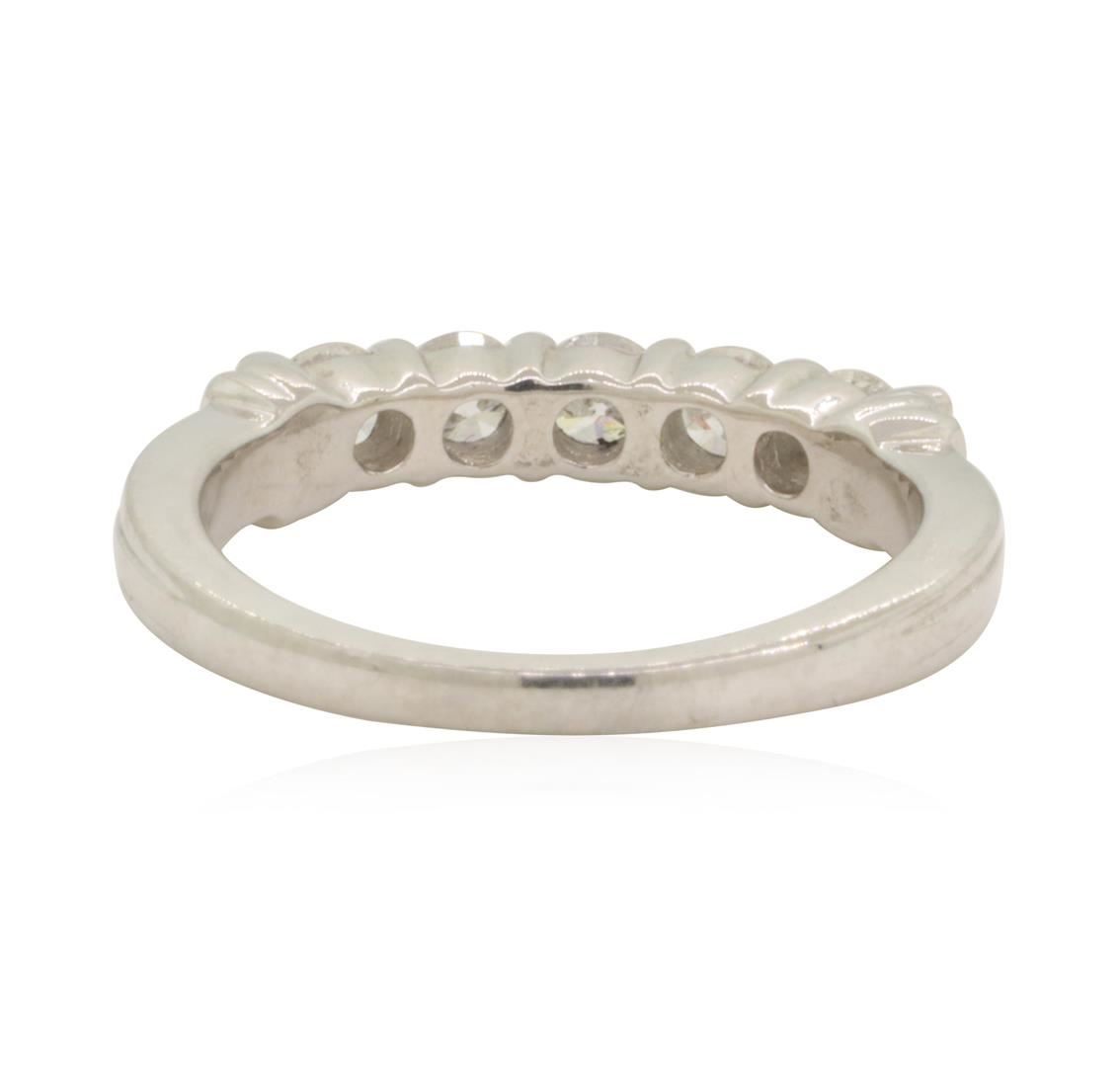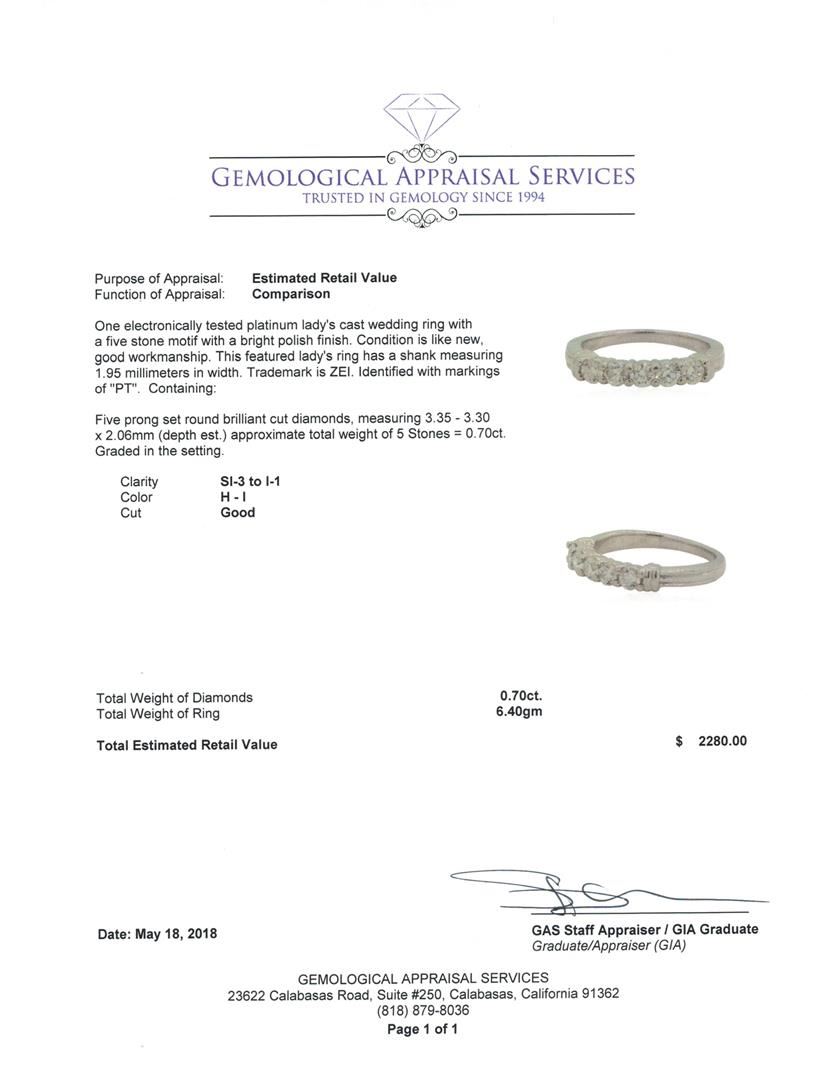 One electronically tested platinum lady's cast wedding ring with a five stone motif with a bright polish finish. This featured lady's ring has a shank measuring 1.95 millimeters in width. Trademark is ZEI. Identified with markings of 'PT'. Condition is like new, good workmanship. Containing: Five prong set round brilliant cut diamonds, measuring 3.35 - 3.30 x 2.06mm (depth est.) approximate total weight of 5 Stones = 0.70ct. Graded in the setting. Color H - I Clarity SI-3 to I-1 Cut Good. Total Weight of Diamonds 0.70ct.. Total Weight of Ring 6.40gm GAS Appraised at $2280.00. GAS Appraised.