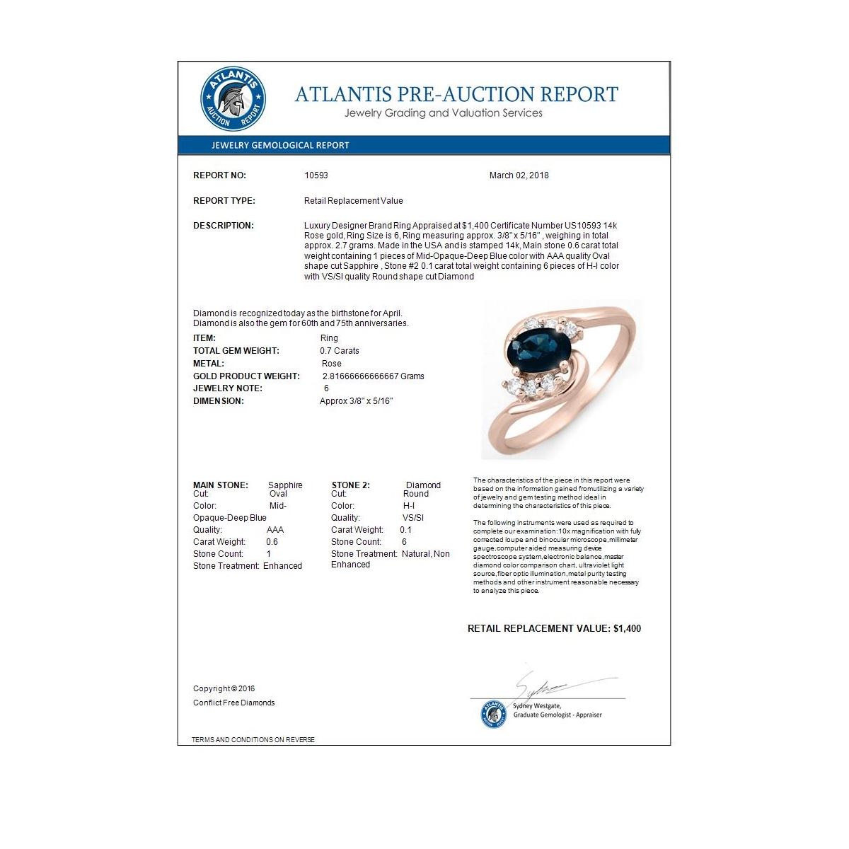 REF-23H3A -10593 ---- 0.70 CTW Blue Sapphire & Diamond Ring 14K Rose Gold ---- Luxury Designer Brand Ring Appraised at $1,400 Certificate Number US10593 14k Rose gold, Ring Size is 6, Ring measuring approx. 3/8" x 5/16" , weighing in total approx. 2.7 grams. Made in the USA and is stamped 14k, Main stone 0.6 carat total weight containing 1 pieces of Mid-Opaque-Deep Blue color with AAA quality Oval shape cut Sapphire , Stone #2 0.1 carat total weight containing 6 pieces of H-I color with VS/SI quality Round shape cut Diamond