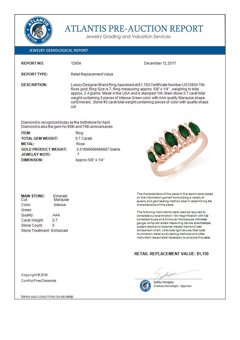 REF-17W6F -12654 ---- 0.70 CTW Emerald Ring 10K Rose Gold ---- Luxury Designer Brand Ring Appraised at $1,150 Certificate Number US12654 10k Rose gold, Ring Size is 7, Ring measuring approx. 5/8" x 1/4" , weighing in total approx. 2.4 grams. Made in the USA and is stamped 10k, Main stone 0.7 carat total weight containing 5 pieces of Intense Green color with AAA quality Marquise shape cut Emerald , Stone #2 carat total weight containing pieces of color with quality shape cut