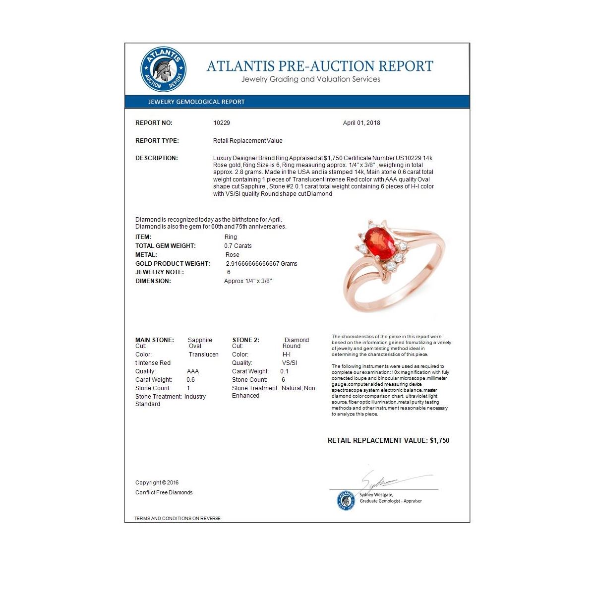 REF-24X4T -10229 ---- 0.70 CTW Red Sapphire & Diamond Ring 14K Rose Gold ---- Luxury Designer Brand Ring Appraised at $1,750 Certificate Number US10229 14k Rose gold, Ring Size is 6, Ring measuring approx. 1/4" x 3/8" , weighing in total approx. 2.8 grams. Made in the USA and is stamped 14k, Main stone 0.6 carat total weight containing 1 pieces of Translucent Intense Red color with AAA quality Oval shape cut Sapphire , Stone #2 0.1 carat total weight containing 6 pieces of H-I color with VS/SI quality Round shape cut Diamond