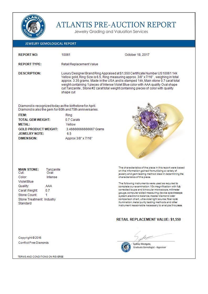 REF-21K5W -10061 ---- 0.70 CTW Tanzanite Ring 14K Yellow Gold ---- Luxury Designer Brand Ring Appraised at $1,550 Certificate Number US10061 14k Yellow gold, Ring Size is 6.5, Ring measuring approx. 3/8" x 7/16" , weighing in total approx. 3.35 grams. Made in the USA and is stamped 14k, Main stone 0.7 carat total weight containing 1 pieces of Intense Violet Blue color with AAA quality Oval shape cut Tanzanite , Stone #2 carat total weight containing pieces of color with quality shape cut