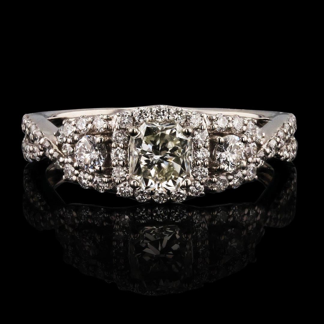 Platinum Diamond Ring One polished, stamped, and tested platinum ring with a bright finish. The ring is mounted with 1 genuine diamond center stone weighing approximately 0.70 carat, and 56 genuine round diamonds weighing approximately 0.69 carats. This item weighs 5.5 grams, condition is new, excellent workmanship. MAIN GEMSTONE Identity: Natural Diamond Shape: Octagonal Cutting Style: Modified Brilliant Cut Measurements: 5.1 x 4.5mm Weight: 0.70 carat Color Grade: J Clarity Grade: SI3 Polish: Very Good Symmetry: Very Good Refractive Index: 2.417 Hardness: 10 ADJACENT GEMSTONES ON RING Identity: Natural Diamond Shape: Round Cutting Style: Brilliant Cut Quantity: 56 Diamonds Measurements: 1.2 - 2.8mm Total Weight: 0.69 carats Color Grade: G - H Clarity Grade: VS2 to SI2 Refractive Index: 2.418 Hardness: 10 CENTER DIAMOND WEIGHT: 0.70ct TOTAL DIAMOND WEIGHT: 1.39ctw WEIGHT OF ITEM: 5.5 grams GOLD CONTENT: 14K White Gold #LREF-3977