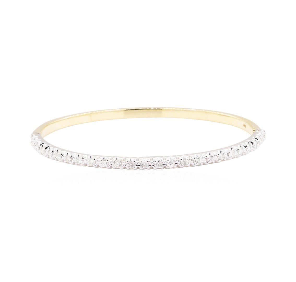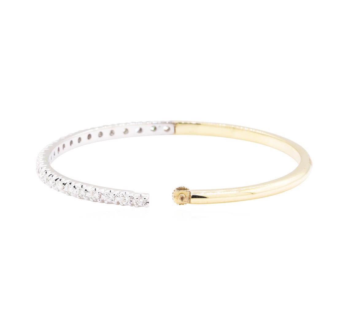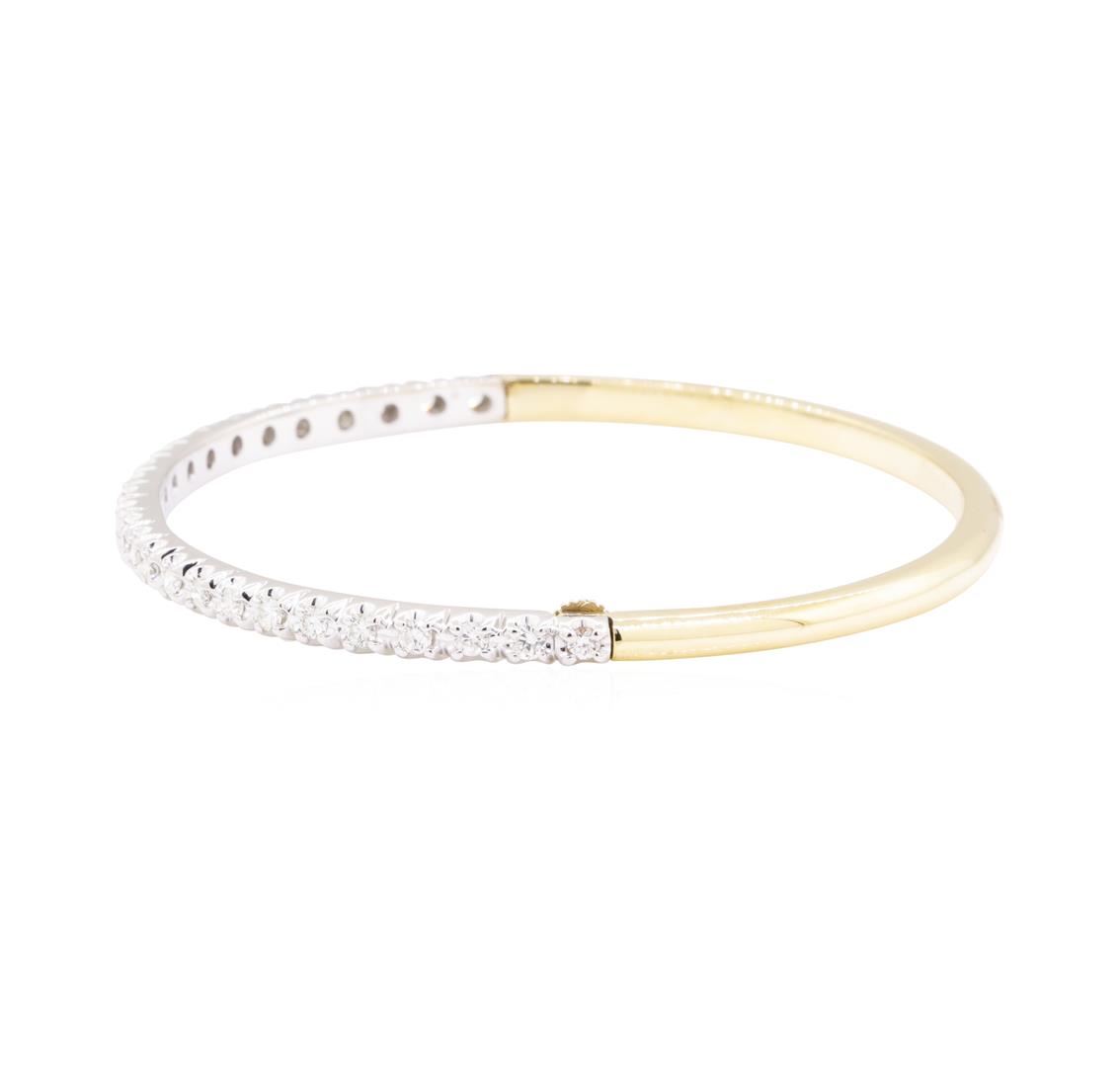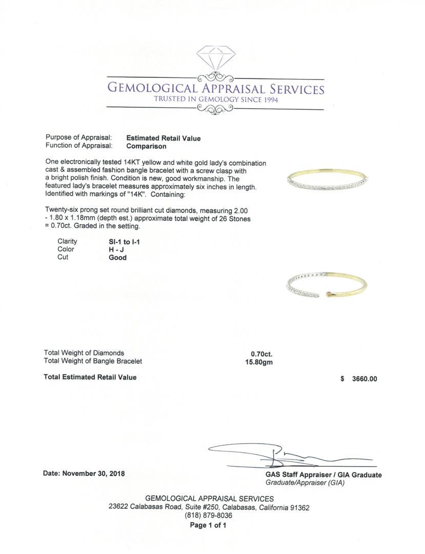 One electronically tested 14KT yellow and white gold lady's combination cast & assembled fashion bangle bracelet with a screw clasp with a bright polish finish. The featured lady's bracelet measures approximately six inches in length. Identified with markings of '14K'. Condition is new, good workmanship. Containing: Twenty-Six prong set round brilliant cut diamonds, measuring 2.00 - 1.80 x 1.18mm (depth est.) approximate total weight of 26 Stones = 0.70ct. Graded in the setting. Color H - J Clarity SI-1 to I-1 Cut Good. Total Weight of Diamonds 0.70ct.. Total Weight of Bangle Bracelet 15.80gm GAS Appraised at $3660.00. GAS Appraised at $3,660.00.