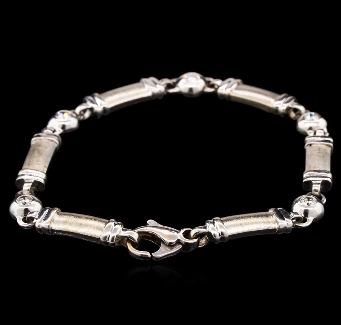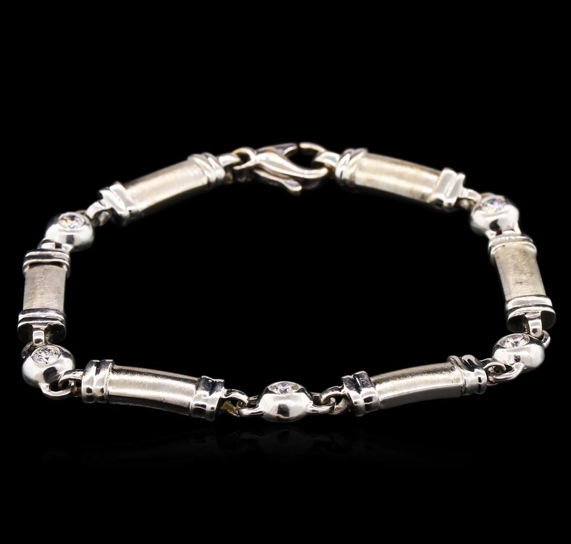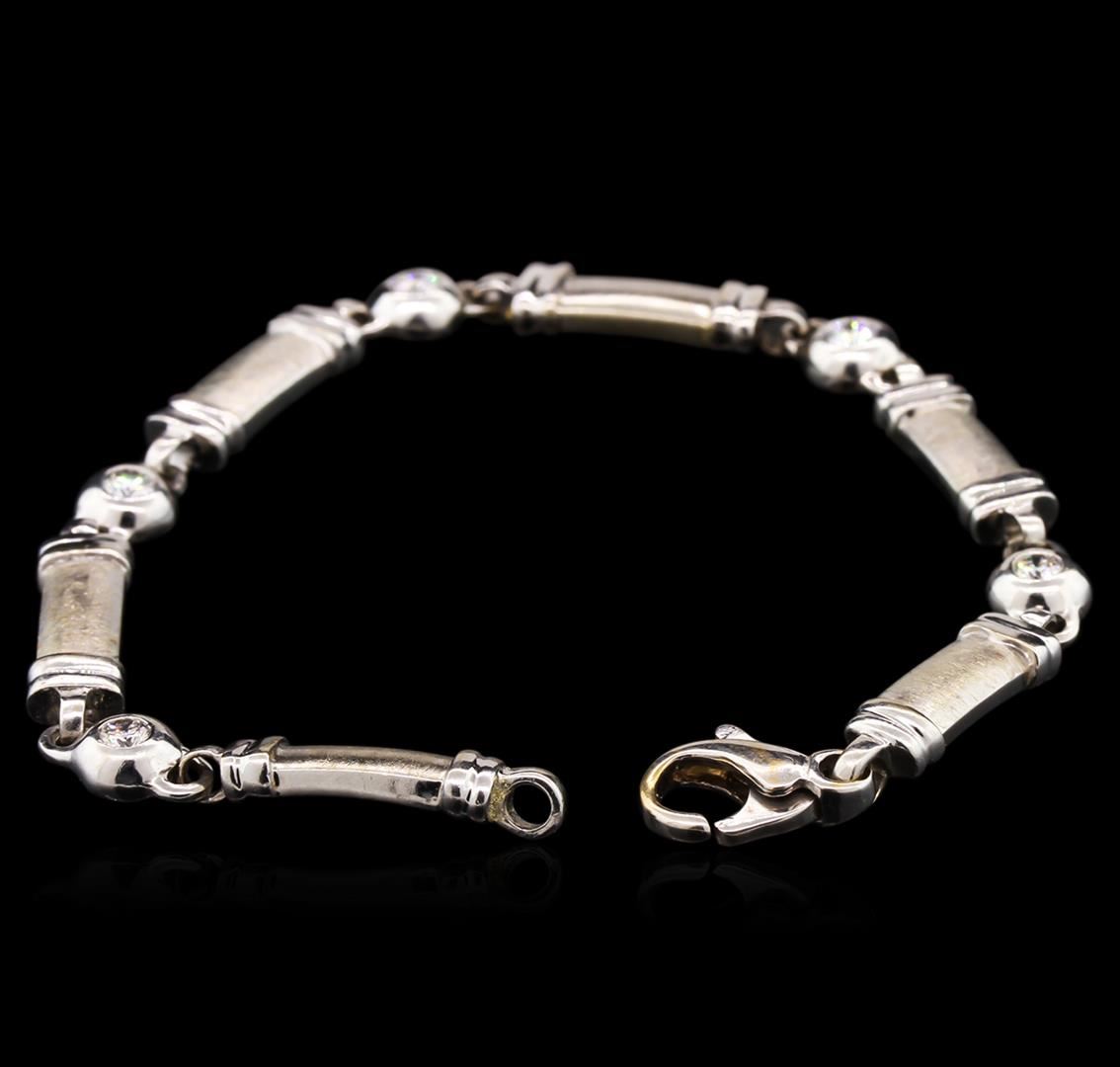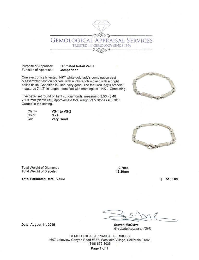 One electronically tested 14KT white gold lady's combination cast & assembled fashion bracelet with a lobster claw clasp with a bright polish finish. The featured lady's bracelet measures 7-1/2" in length. Identified with markings of "14K". Condition is used, very good. Containing: Five bezel set round brilliant cut diamonds, measuring 3.50 - 3.40 x 1.90mm (depth est.) approximate. Total Weight of 5 Stones = 0.70ct. Graded in the setting. Clarity: VS-1 to VS-2. Color: G - Very Good. Total Weight of Diamonds 0.70ct. Total Weight of Bracelet 16.20gm. GAS Appraised at $5,165.00.
