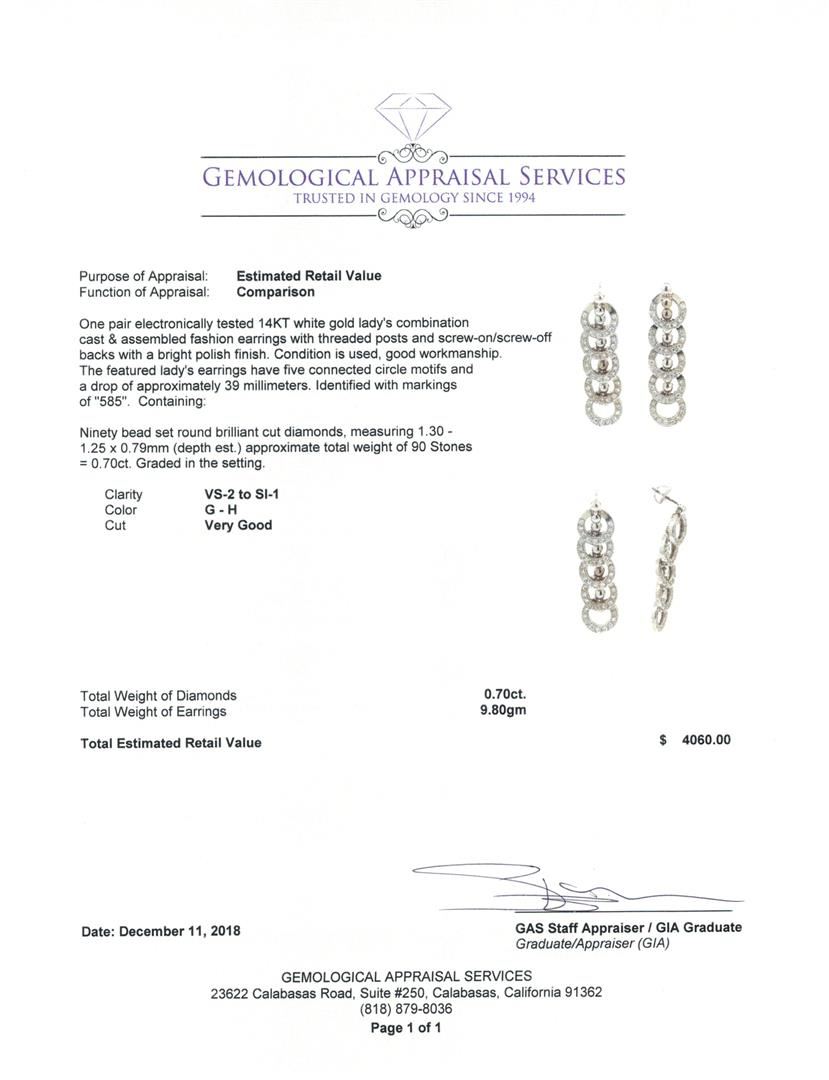 One pair electronically tested 14KT white gold lady's combination cast & assembled fashion earrings with threaded posts and screw-on/screw-off backs with a bright polish finish. The featured lady's earrings have five connected circle motifs and a drop of approximately 39 millimeters. Identified with markings of '585'. Condition is used, good workmanship. Containing: Ninety bead set round brilliant cut diamonds, measuring 1.30 - 1.25 x 0.79mm (depth est.) approximate total weight of 90 Stones = 0.70ct. Graded in the setting. Color G - H Clarity VS-2 to SI-1 Cut Very Good. Total Weight of Diamonds 0.70ct.. Total Weight of Earrings 9.80gm GAS Appraised at $4060.00. GAS Appraised at $4,060.00.