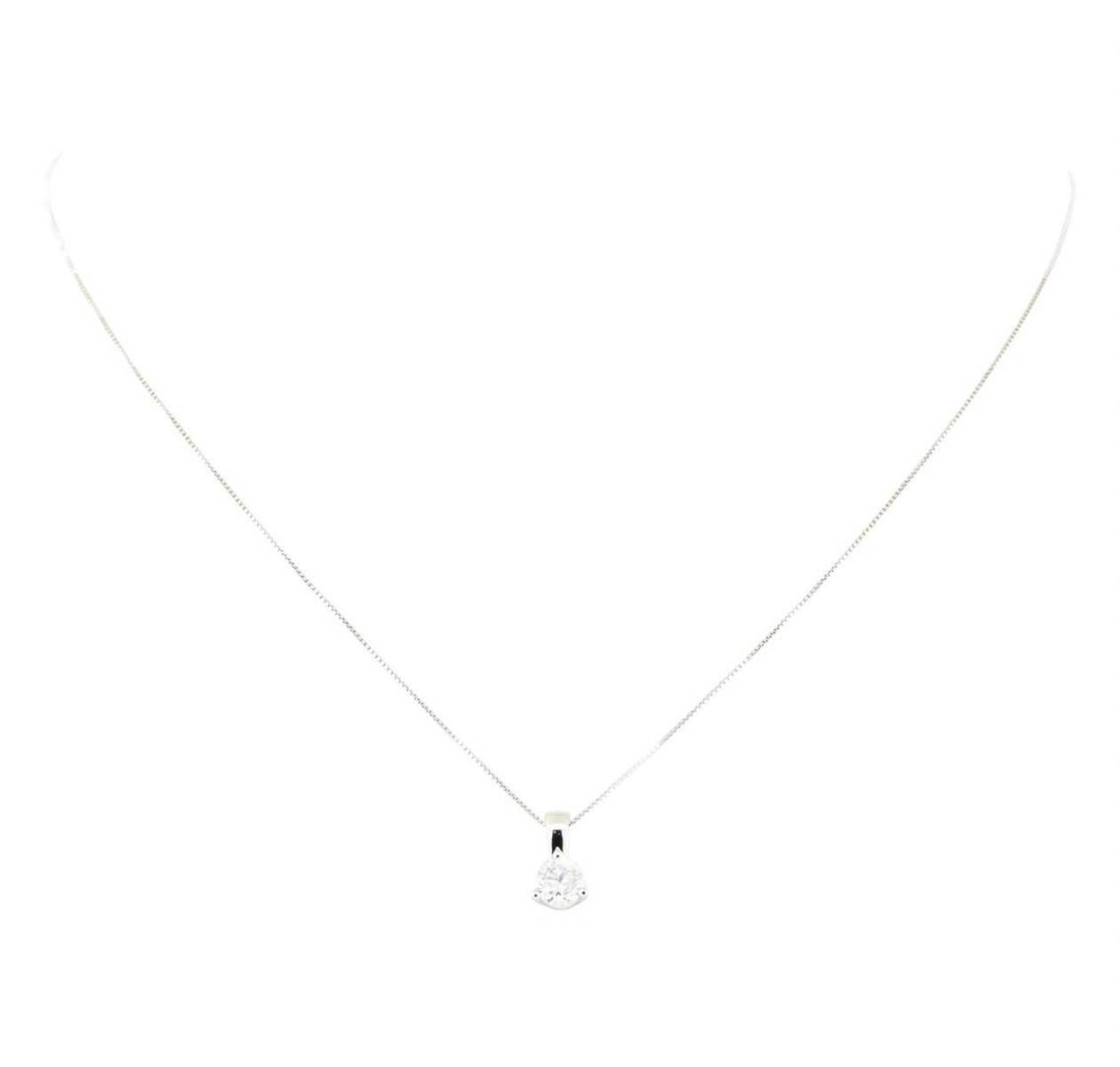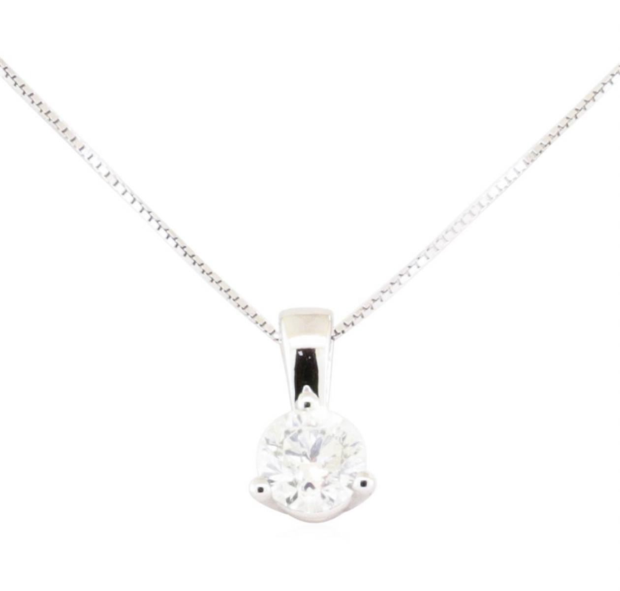 One electronically tested 14KT white gold lady's cast fashion solitaire pendant and chain 16.0' long, 0.60mm square box link with a spring ring clasp with a bright polish finish. Trademark is CID. Identified with markings of '14K'. Condition is new, good workmanship. Containing: One prong set round brilliant cut diamond, measuring 5.57 - 5.54 x 3.61mm (depth est.) approximate weight of 0.70 ct. Graded in the setting. Color H Clarity SI-2 Cut Very Good. Total Weight of Diamonds 0.70 ct.. Total Weight of Pendant And Chain 2.10gm GAS Appraised at $5295.00. GAS Appraised.