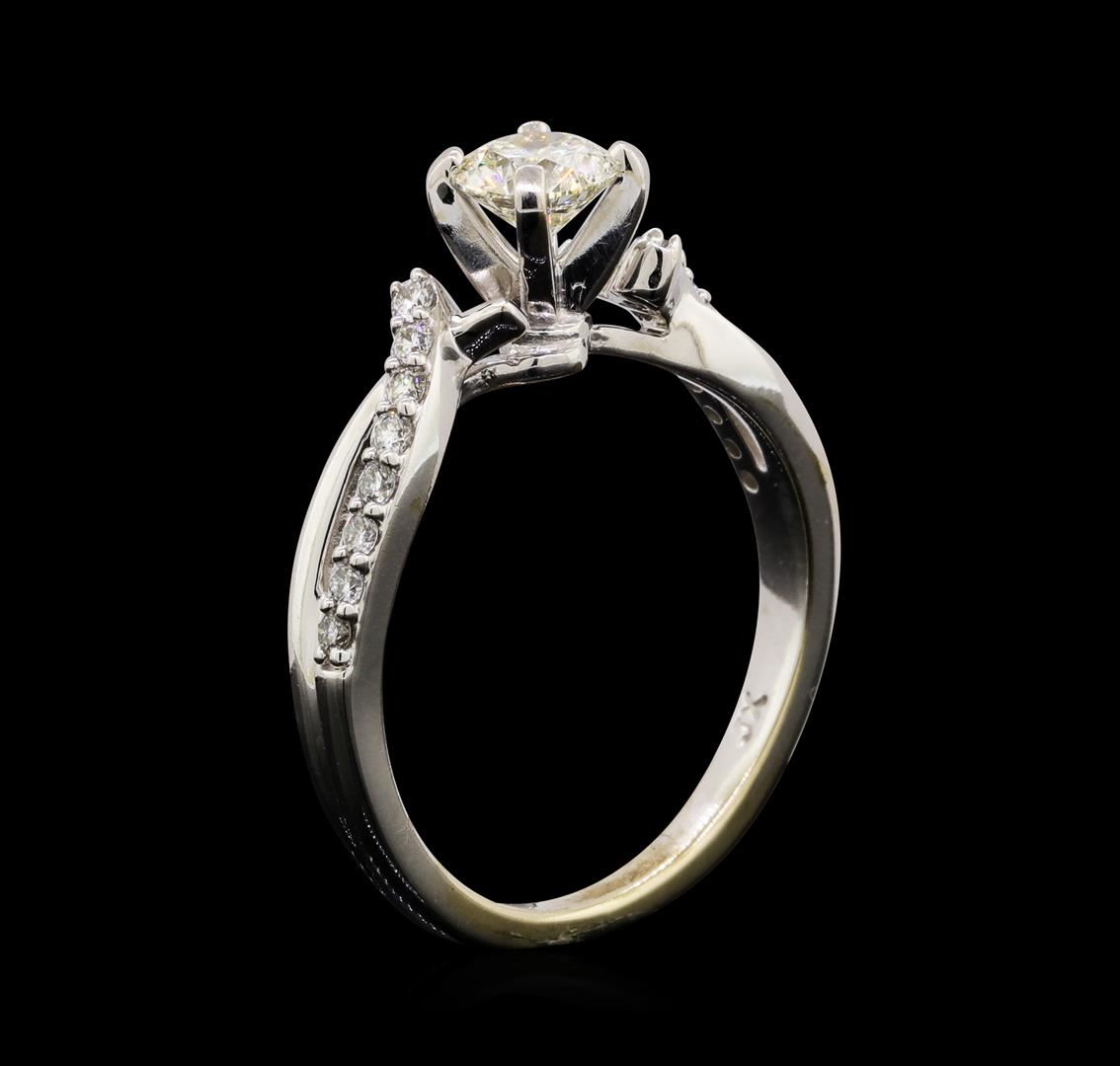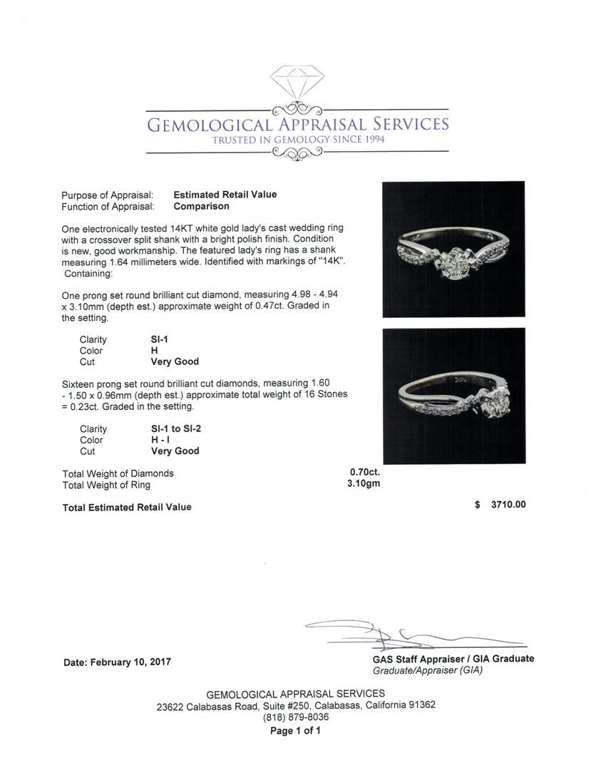 One electronically tested 14KT white gold lady's cast wedding ring with a crossover split shank with a bright polish finish. The featured lady's ring has a shank measuring 1.64 millimeters wide. Identified with markings of '14K'. Condition is new, good workmanship. Containing: One prong set round brilliant cut diamond, measuring 4.98 - 4.94 x 3.10mm (depth est.) approximate weight of 0.47ct. Graded in the setting. Color H Clarity SI-1 Cut Very Good Sixteen prong set round brilliant cut diamonds, measuring 1.60 - 1.50 x 0.96mm (depth est.) approximate total weight of 16 Stones = 0.23ct. Graded in the setting. Color H - I Clarity SI-1 to SI-2 Cut Very Good. Total Weight of Diamonds 0.70ct.. Total Weight of Ring 3.10gm GAS Appraised at $3710.00. GAS Appraised at $3,710.00.