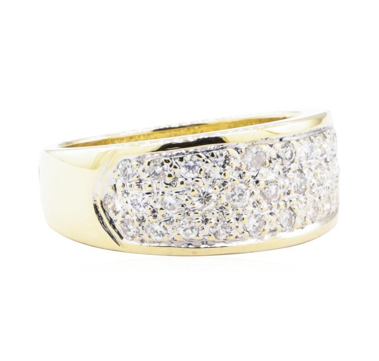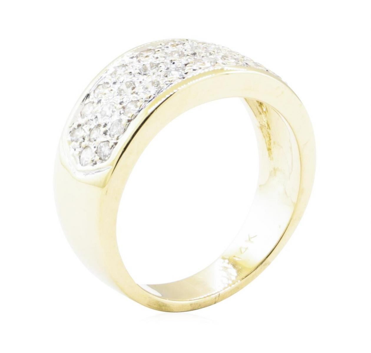One electronically tested 14KT yellow gold lady's cast fashion ring with a tapered wide band with a bright polish finish. The featured lady's ring has a shank measuring 4.15 millimeters wide. Identified with markings of '14K'. Condition is Good. Containing: Thirty-One prong set round brilliant cut diamonds, measuring 1.85 - 1.80 x 1.10mm (depth est.) approximate total weight of 31 Stones = 0.70ct. Graded in the setting. Color H - I Clarity SI-1 to I-1 Cut Good. Total Weight of Diamonds 0.70ct.. Total Weight of Ring 6.50gm GAS Appraised at $2710.00. GAS Appraised.