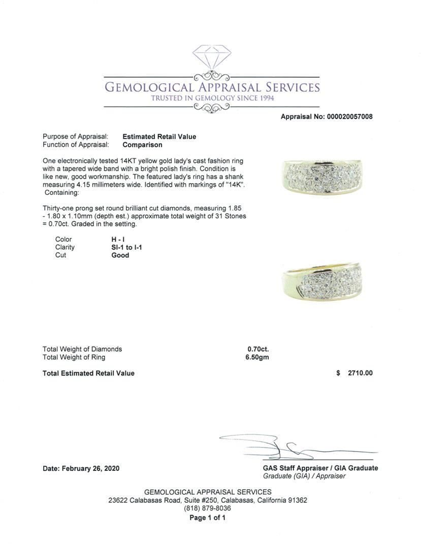One electronically tested 14KT yellow gold lady's cast fashion ring with a tapered wide band with a bright polish finish. The featured lady's ring has a shank measuring 4.15 millimeters wide. Identified with markings of '14K'. Condition is Good. Containing: Thirty-One prong set round brilliant cut diamonds, measuring 1.85 - 1.80 x 1.10mm (depth est.) approximate total weight of 31 Stones = 0.70ct. Graded in the setting. Color H - I Clarity SI-1 to I-1 Cut Good. Total Weight of Diamonds 0.70ct.. Total Weight of Ring 6.50gm GAS Appraised at $2710.00. GAS Appraised.