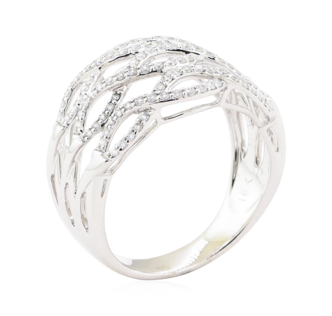 One electronically tested 18KT white gold lady's cast fashion ring with a 3 row undulating crossover motif with a bright polish finish. The featured lady's ring has a shank measuring 4.00 millimeters wide. Identified with markings of '18K'. Condition is new, good workmanship. Containing: One Hundred Eight prong set round brilliant cut diamonds, measuring 1.20 - 1.15 x 0.73mm (depth est.) approximate total weight of 108 Stones = 0.70ct. Graded in the setting. Color G - H Clarity VS-1 to SI-1 Cut Very Good. Total Weight of Diamonds 0.70ct.. Total Weight of Ring 5.20gm GAS Appraised at $3960.00. GAS Appraised at $3,960.00.