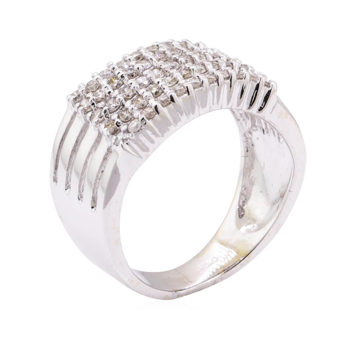 One electronically tested 18KT white gold lady's cast fashion ring with a five row wave split shank with a bright polish finish. The featured lady's ring has a shank measuring 3.90 millimeters wide. Identified with markings of '18K'. Condition is like new, good workmanship. Containing: Fifty-Five prong set round brilliant cut diamonds, measuring 1.50 - 1.45 x 0.92mm (depth est.) approximate total weight of 55 Stones = 0.70ct. Graded in the setting. Color I - J Clarity SI-1 to I-1 Cut Good. Total Weight of Diamonds 0.70ct.. Total Weight of Ring 6.00gm GAS Appraised at  $3075.00. GAS Appraised.