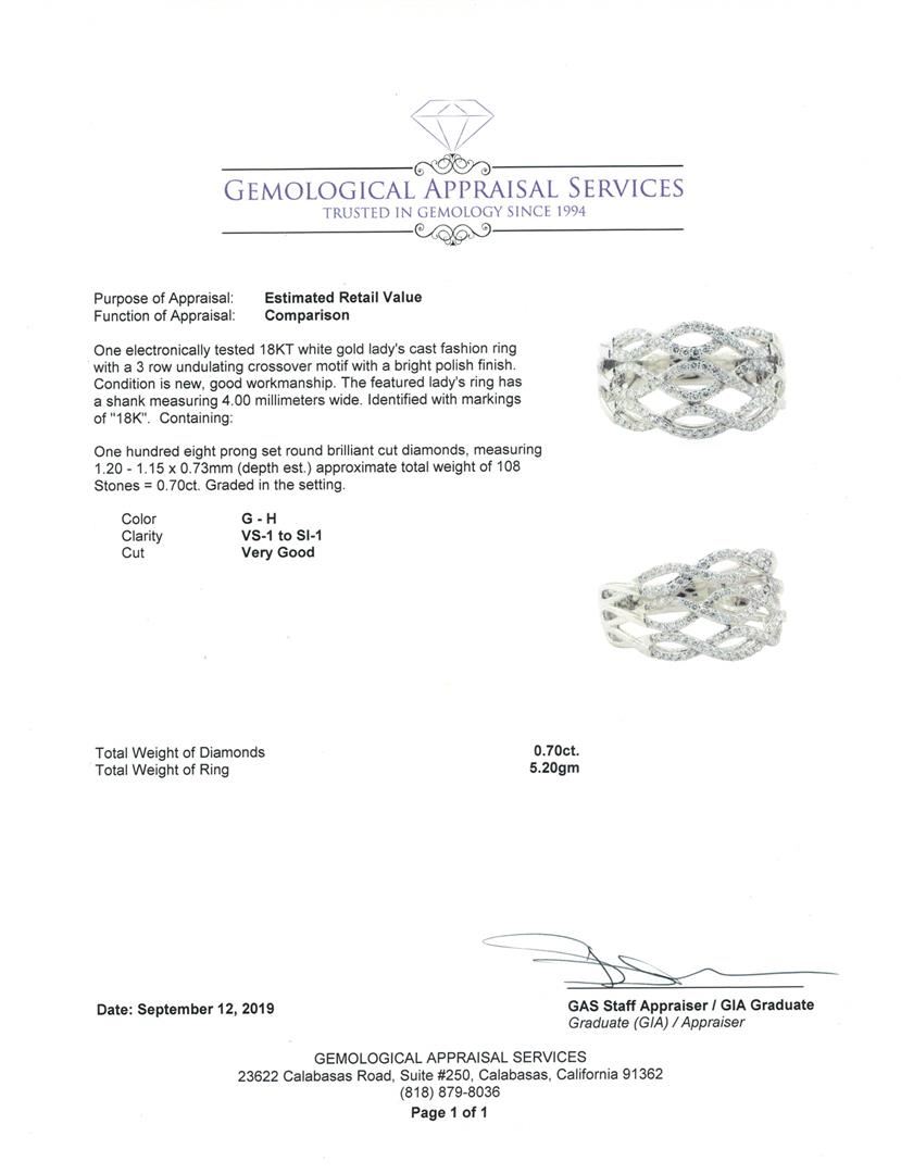 One electronically tested 18KT white gold lady's cast fashion ring with a 3 row undulating crossover motif with a bright polish finish. The featured lady's ring has a shank measuring 4.00 millimeters wide. Identified with markings of '18K'. Condition is n