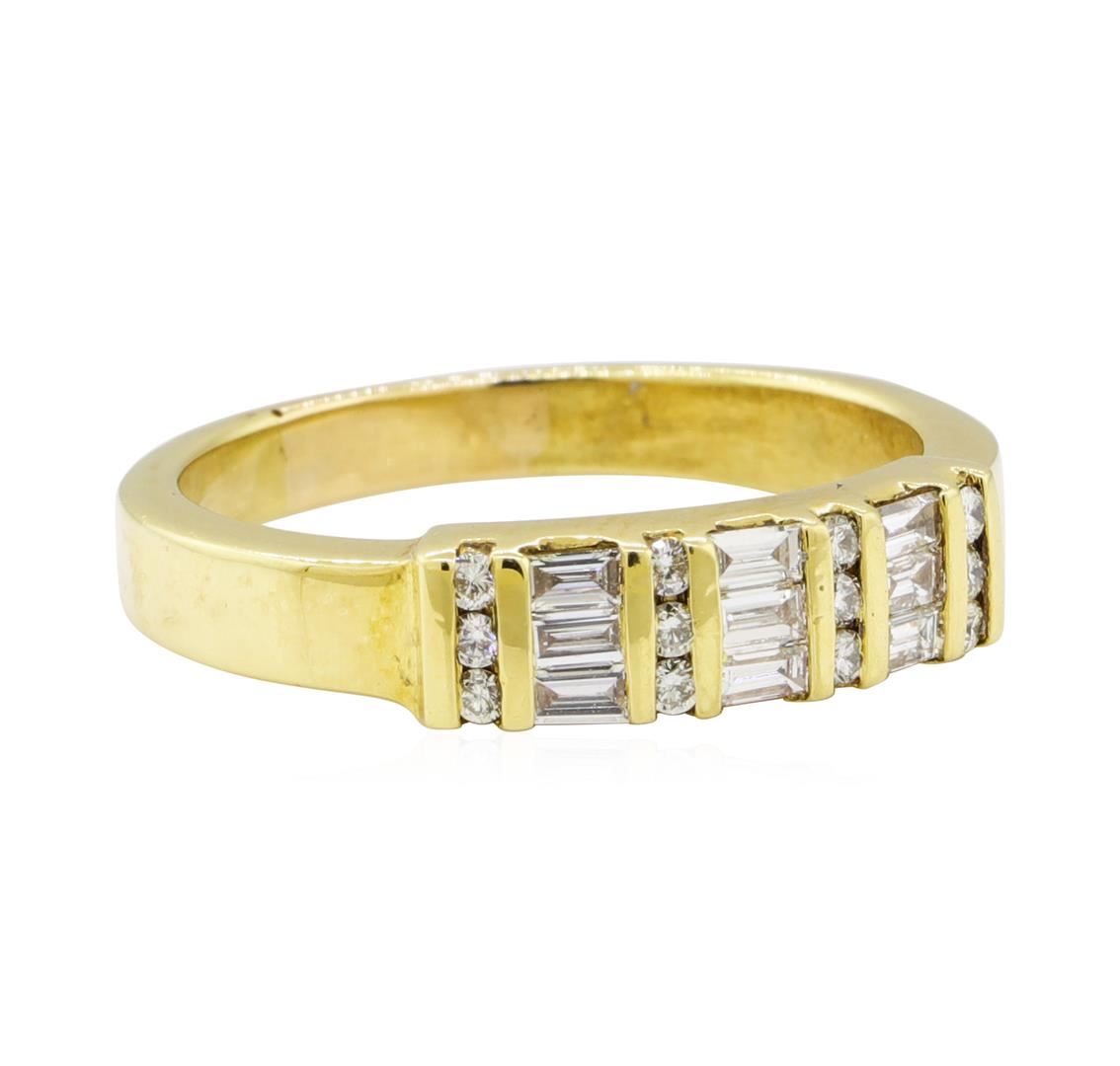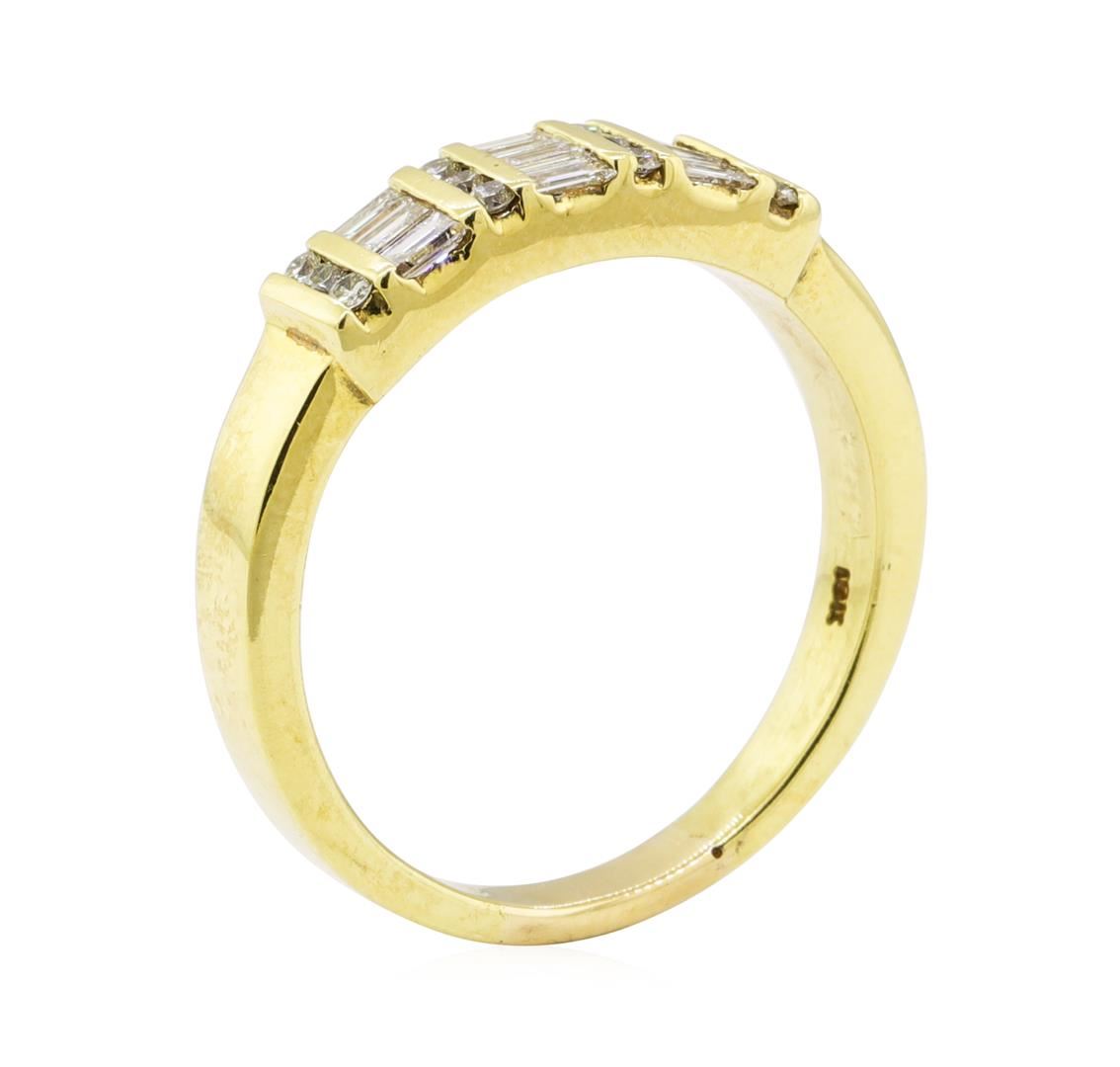 One electronically tested 18KT yellow gold lady's cast fashion ring with a straight line halo with a bright polish finish. The featured lady's ring has a shank measuring 2.90 millimeters wide. Identified with markings of '18K'. Condition is like new, good