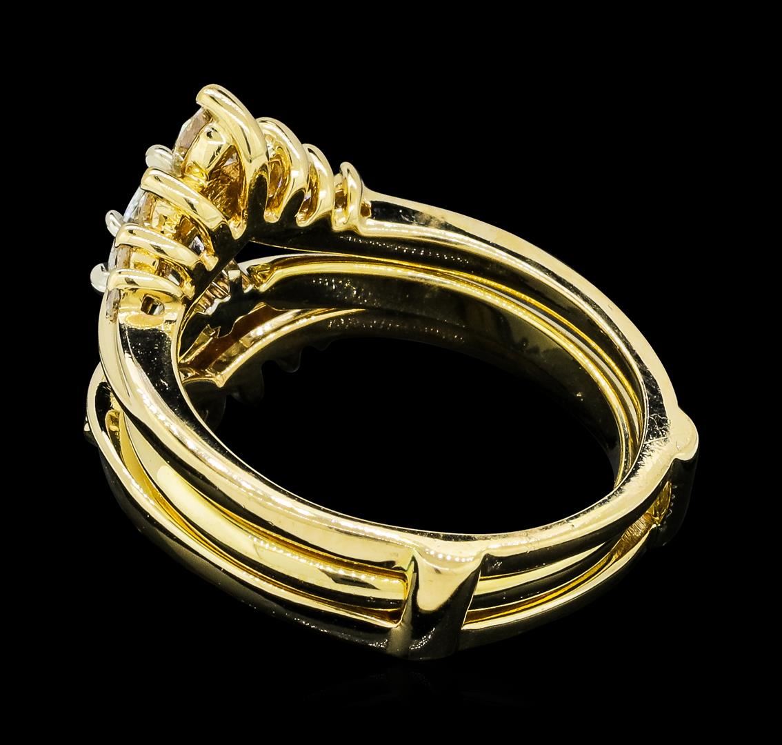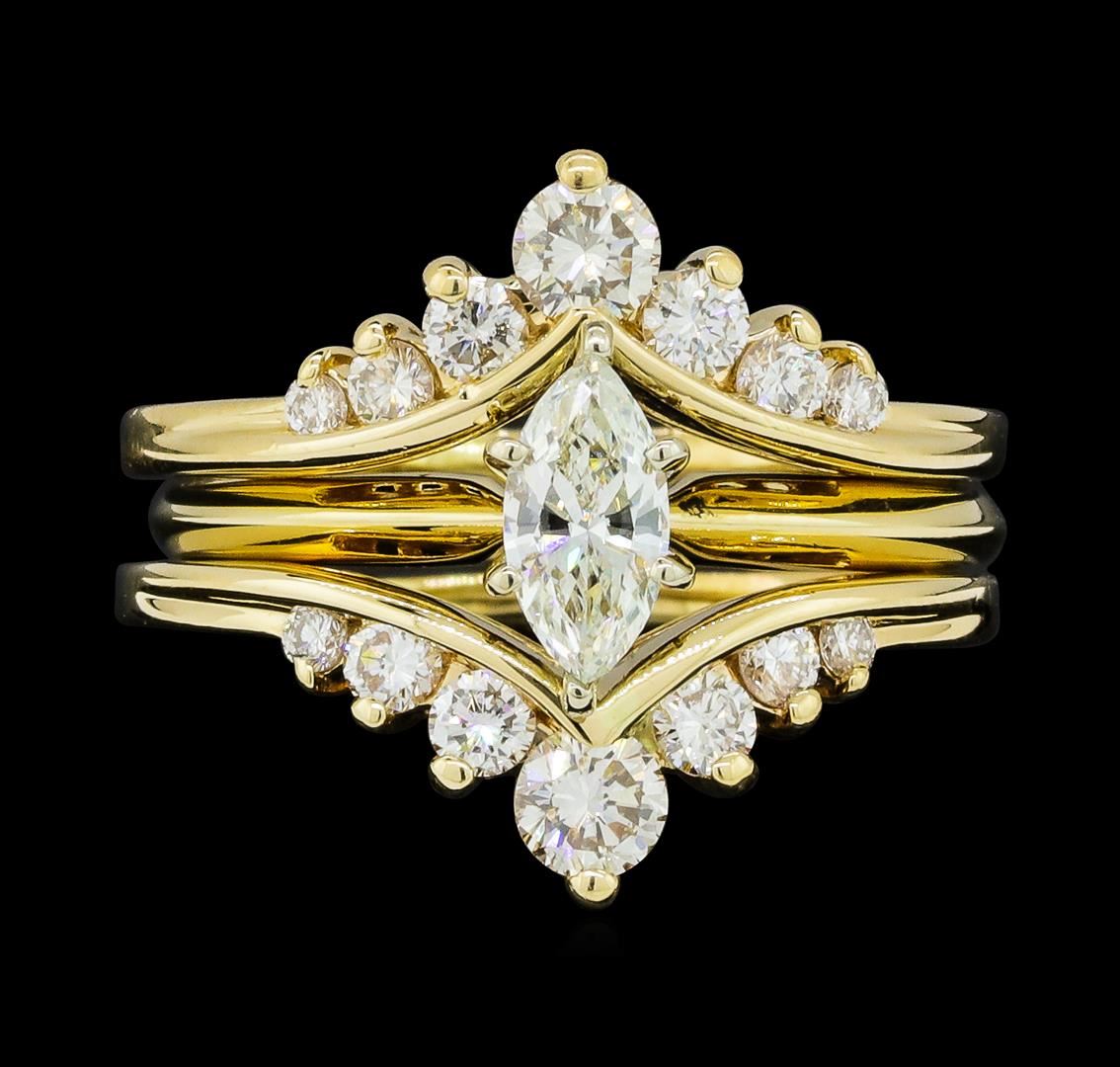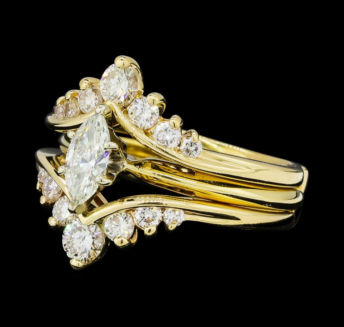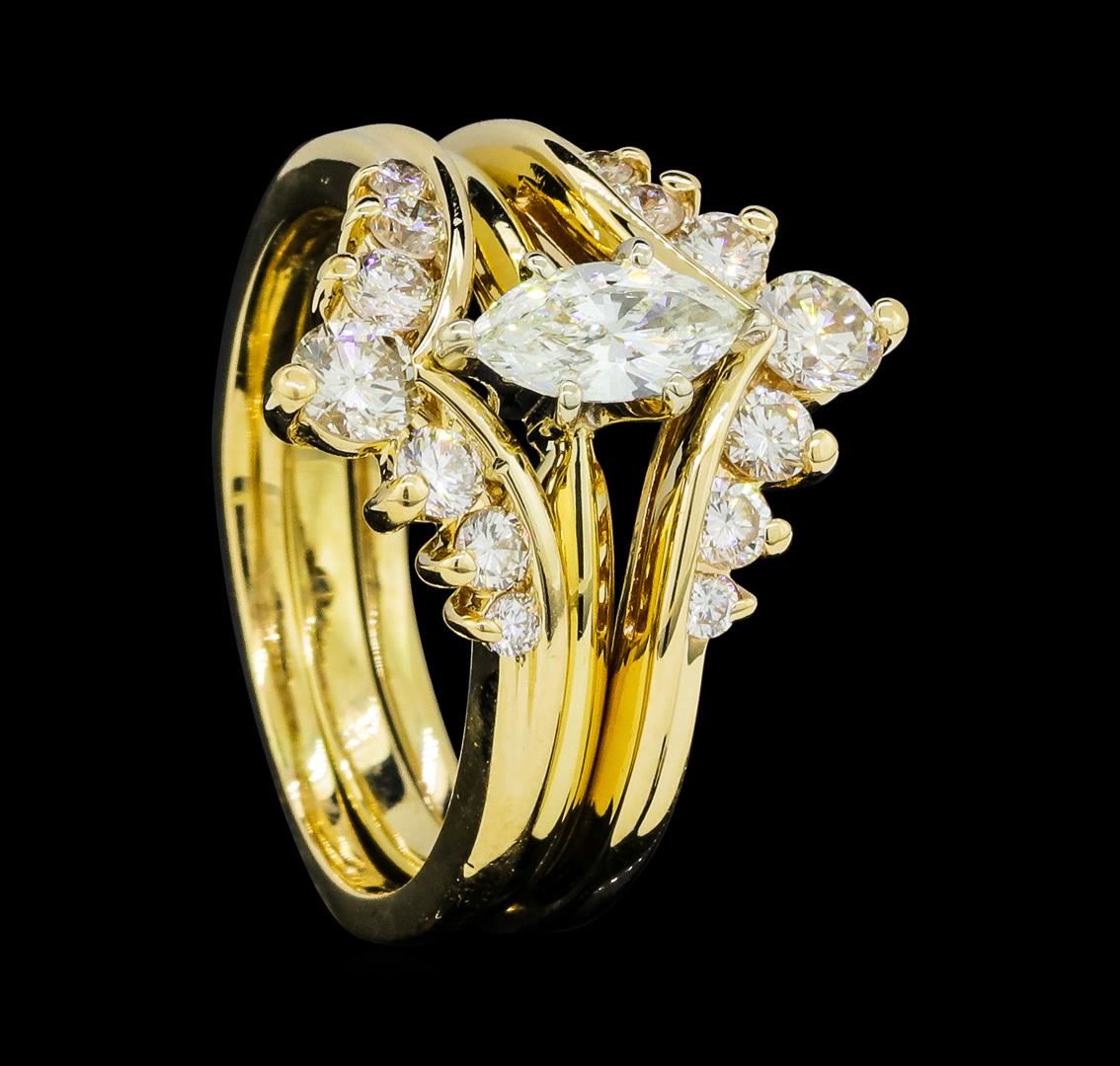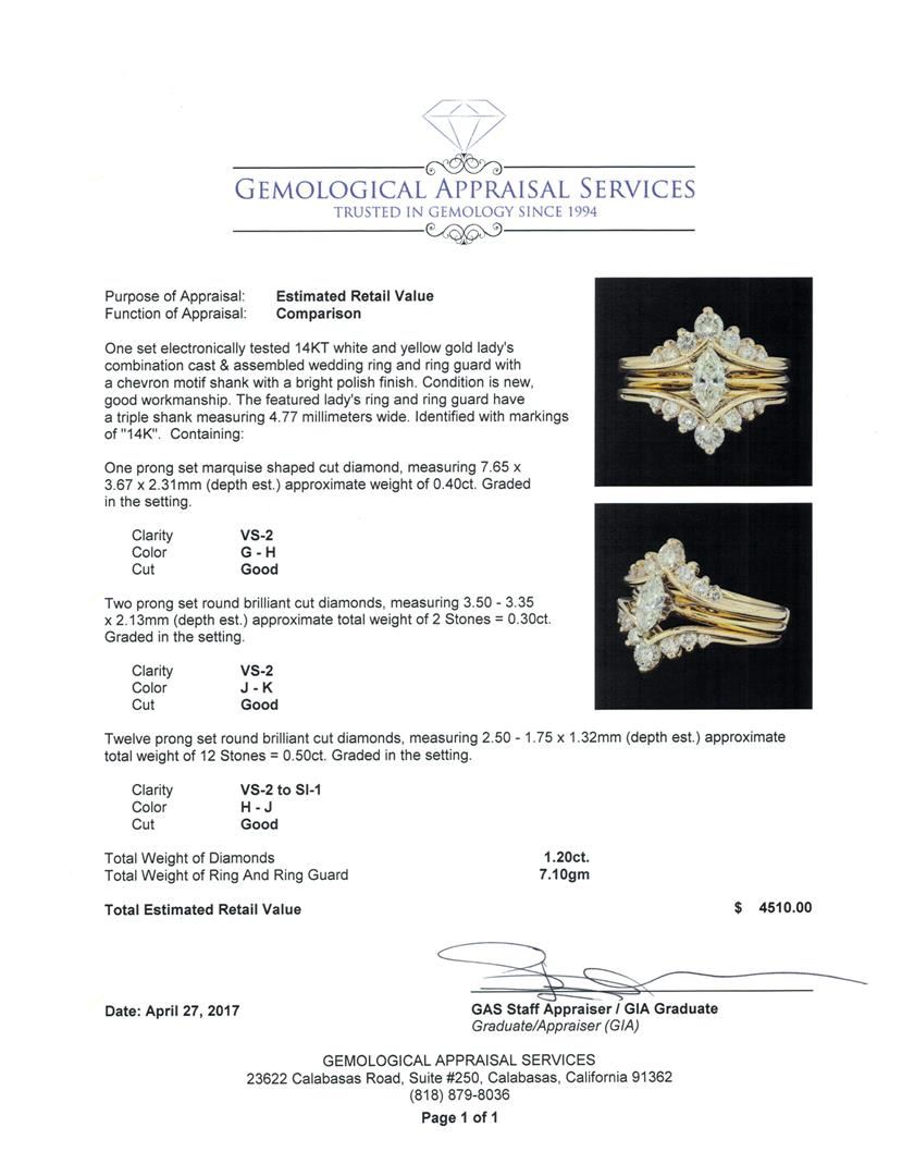 One set electronically tested 14KT white and yellow gold lady's combination cast & assembled wedding ring and ring guard with a chevron motif shank with a bright polish finish. The featured lady's ring and ring guard have a triple shank measuring 4.77 millimeters wide. Identified with markings of '14K'. Condition is new, good workmanship. Containing: One prong set marquise shaped cut diamond, measuring 7.65 x 3.67 x 2.31mm (depth est.) approximate weight of 0.40ct. Graded in the setting. Color G - H Clarity VS-2 Cut Good Two prong set round brilliant cut diamonds, measuring 3.50 - 3.35 x 2.13mm (depth est.) approximate total weight of 2 Stones = 0.30ct. Graded in the setting. Color J - K Clarity VS-2 Cut Good Twelve prong set round brilliant cut diamonds, measuring 2.50 - 1.75 x 1.32mm (depth est.) approximate total weight of 12 Stones = 0.50ct. Graded in the setting. Color H - J Clarity VS-2 to SI-1 Cut Good. Total Weight of Diamonds 1.20ct.. Total Weight of Ring And Ring Guard 7.10gm GAS Appraised at $4510.00. GAS Appraised at $4,510.00.