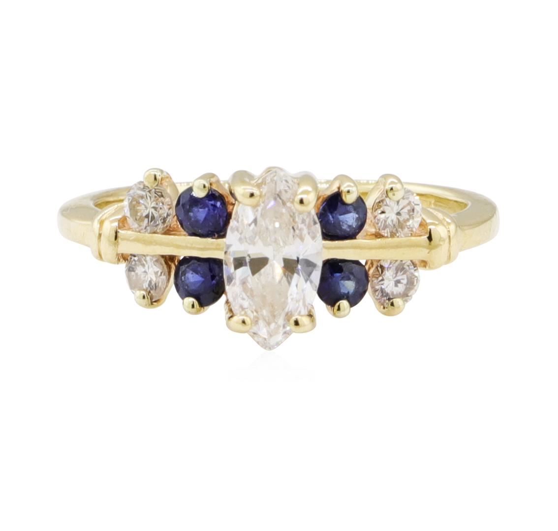 One ring featuring: 14KT yellow gold weighing 2.2 grams containing one marquise diamond weighing 0.40 ct, side diamonds weighing 0.15ctw and sapphires weighing 0.15ctw.