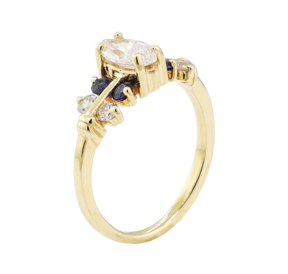 One ring featuring: 14KT yellow gold weighing 2.2 grams containing one marquise diamond weighing 0.40 ct, side diamonds weighing 0.15ctw and sapphires weighing 0.15ctw.