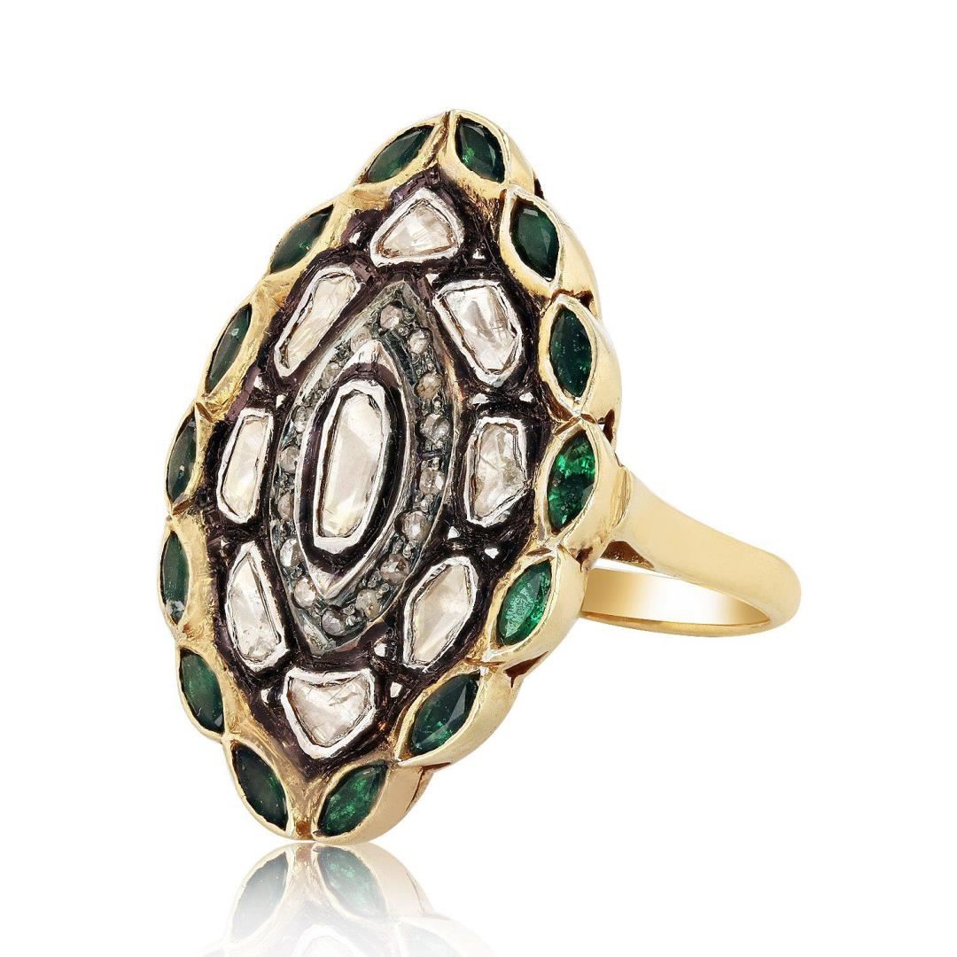One Custom Cast and Assembled Silver and Gold Emerald and Diamond Ring 14 Marquise Emeralds. Carat Wt.: 0.70 cts Clarity: Hvy. Included Color: Green Treatment: Multiple Trace #: A15K04 Twenty Five Rose Cut Diamonds: Carat: 0.74 cts. Clarity: SI-2 t