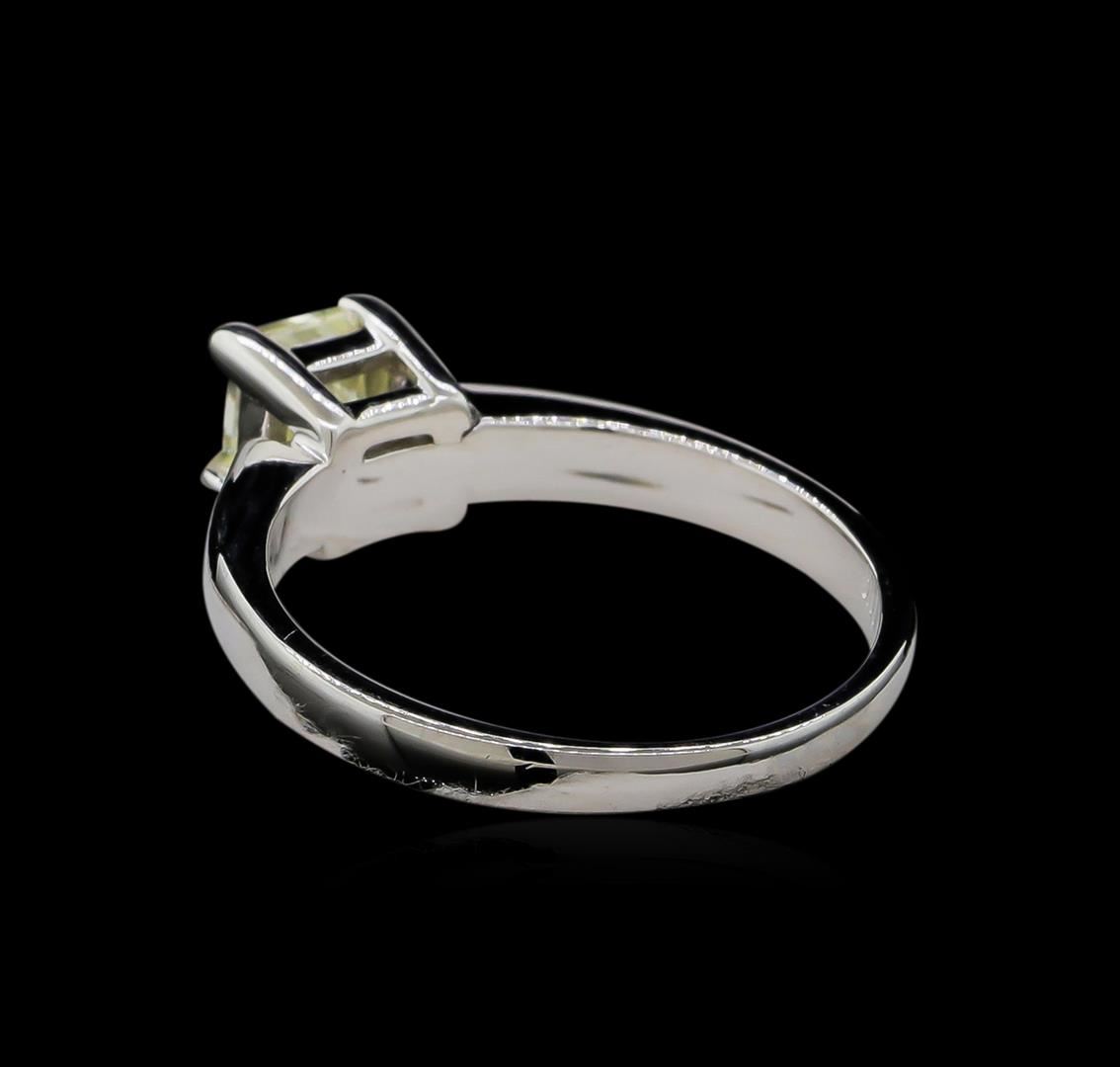 One electronically tested 14KT white gold ladies cast diamond solitaire ring with a bright finish. Identified with markings of "14K". Condition is new, good workmanship. Containing: One prong set princess cut diamond, measuring 5.16 x 4.50 x 3.49mm (depth est.), 7.00.%. GTCF approximate weight of 0.70ct with a faint blue fluorescence. Graded in the setting. Clarity: SI-1. Depth: 77.6%. Table 82.2%. Pavil. Depth%. 61.1%. Total Weight of Diamonds 0.70ct. Total Weight of Solitaire Ring 3.09gm. AIG Appraised at $2,550.00.