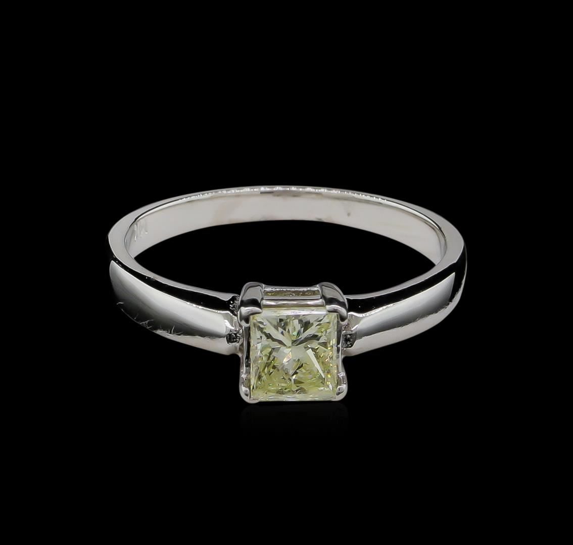 One electronically tested 14KT white gold ladies cast diamond solitaire ring with a bright finish. Identified with markings of "14K". Condition is new, good workmanship. Containing: One prong set princess cut diamond, measuring 5.16 x 4.50 x 3.49mm (depth