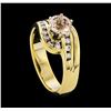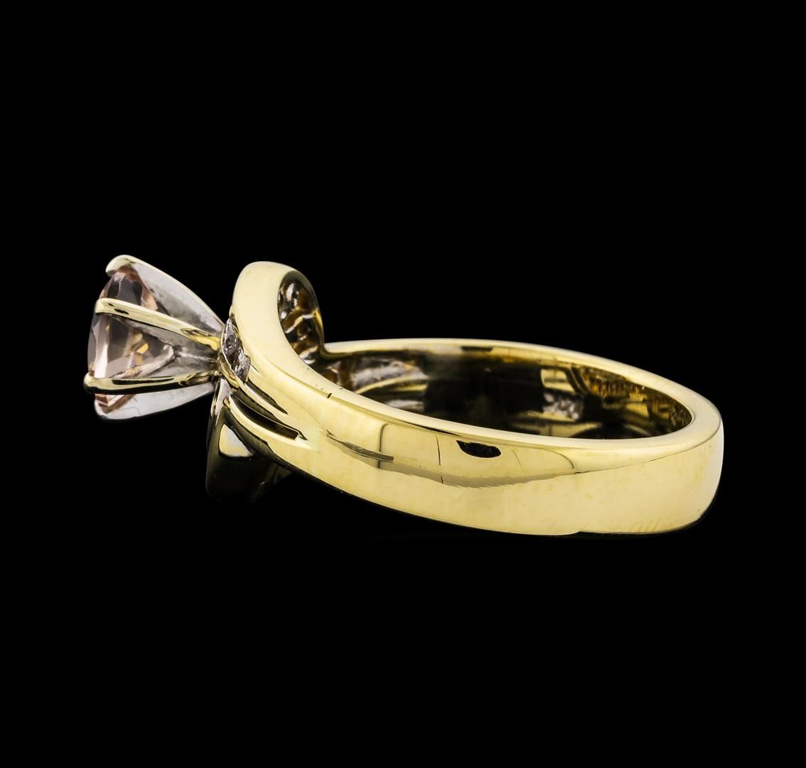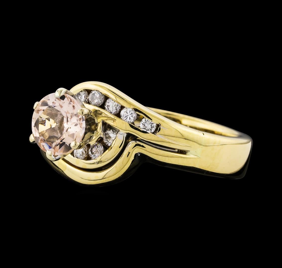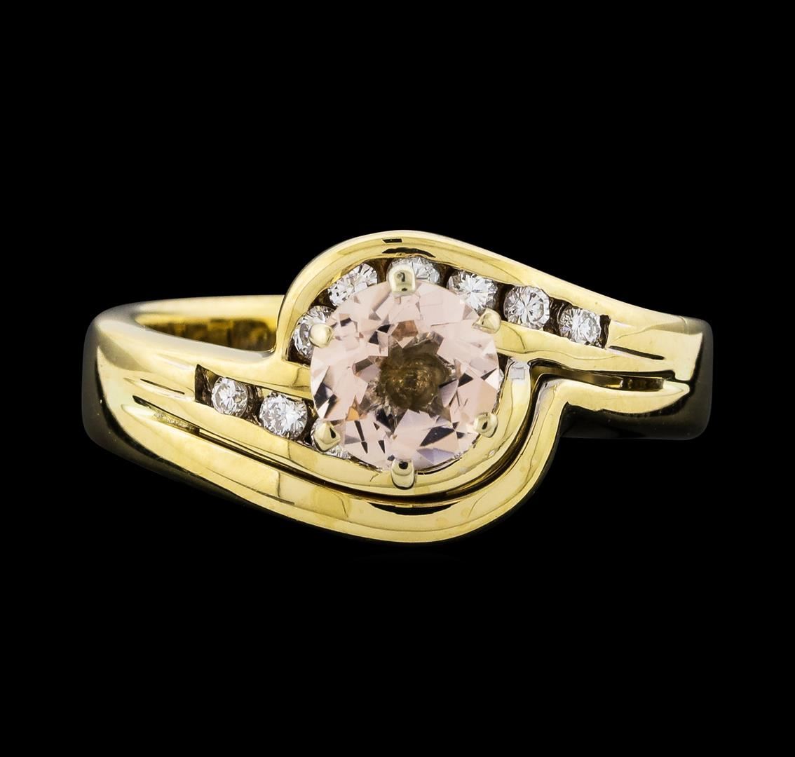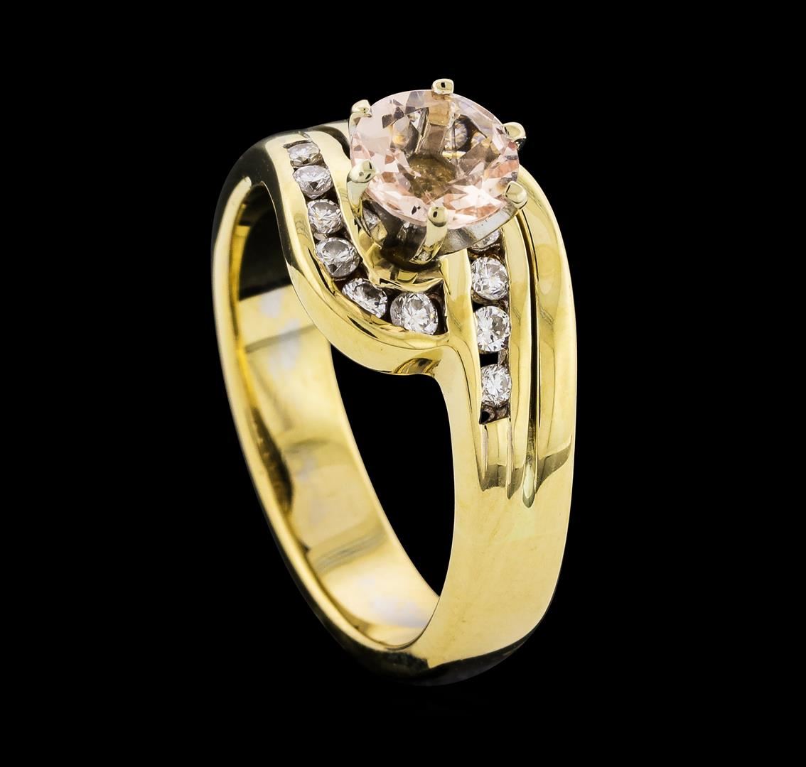 One Morganite and Diamond Ring featuring: 14KT Yellow Gold with a total weight of 6.39 grams, Morganite with a total weight of 0.70ct, and side diamonds with a total weight of 0.15ctw.