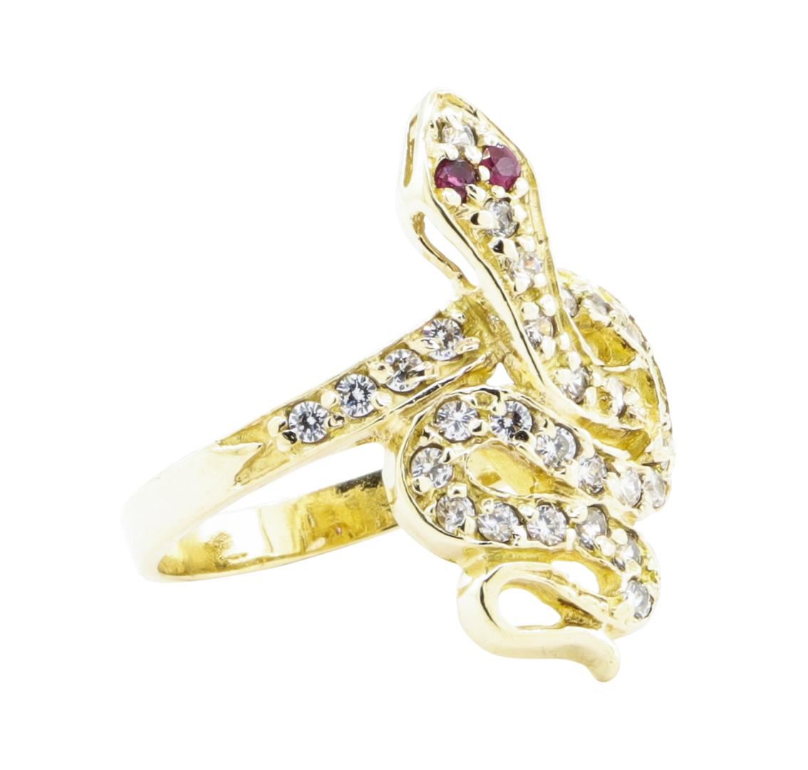 One snake ring featuring: 14KT yellow gold weighing 3.6 grams containing rubies and cubic zirconia weighing 0.70ctw.