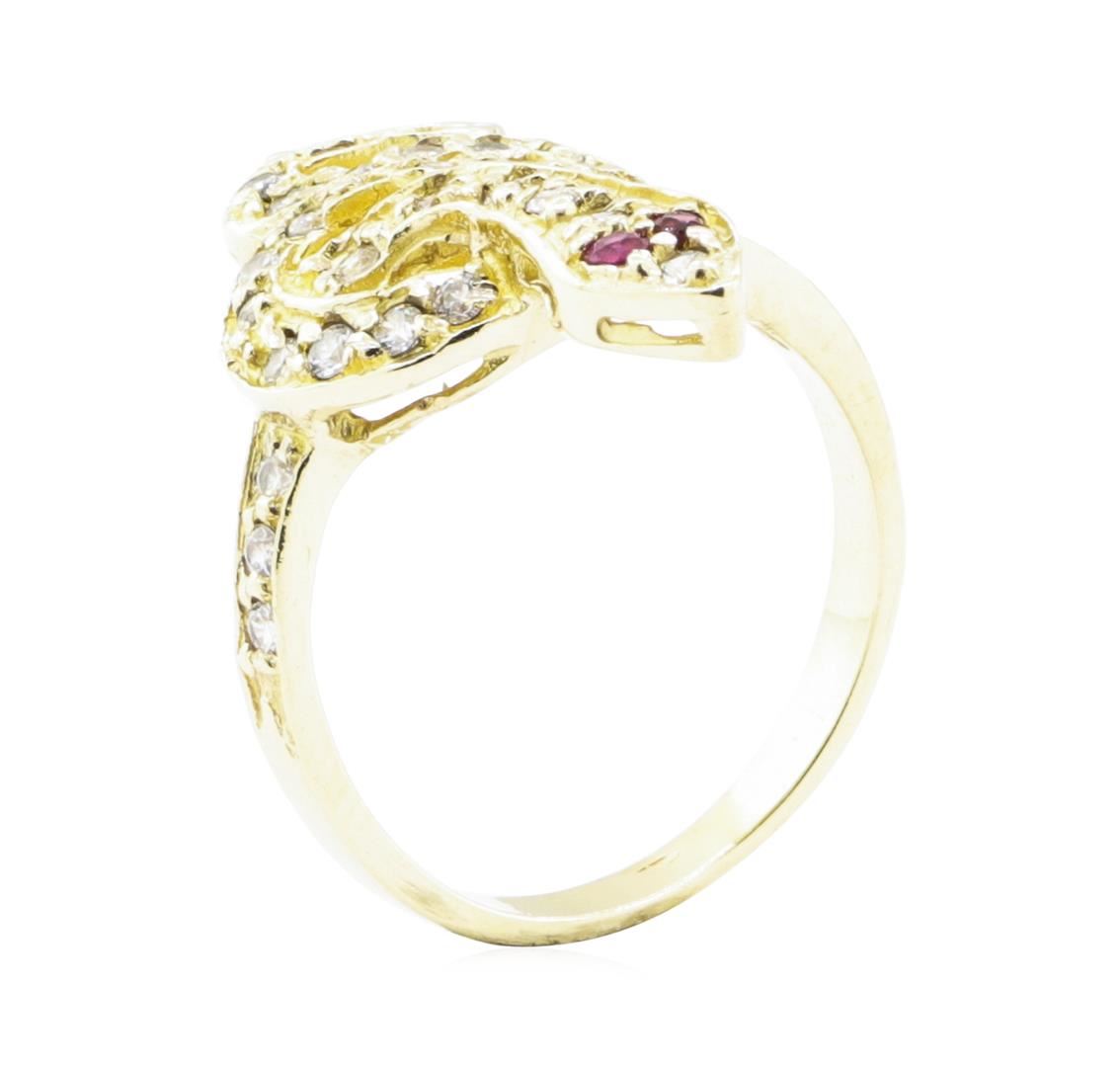 One snake ring featuring: 14KT yellow gold weighing 3.6 grams containing rubies and cubic zirconia weighing 0.70ctw.