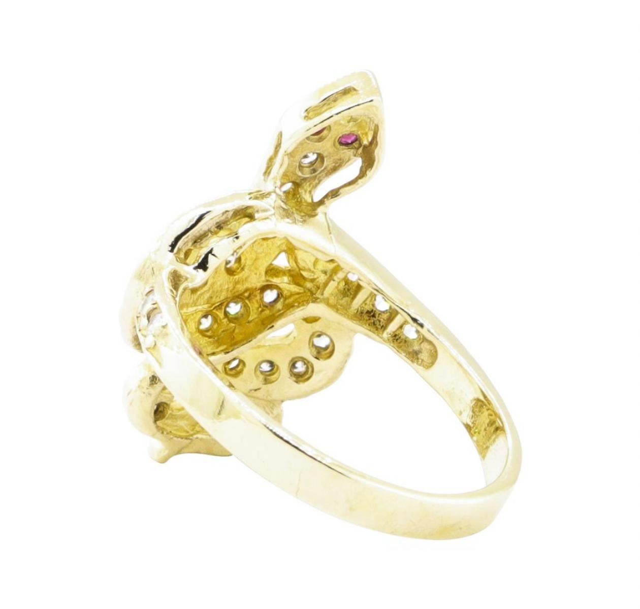 One snake ring featuring: 14KT yellow gold weighing 3.6 grams containing rubies and cubic zirconia weighing 0.70 ctw.