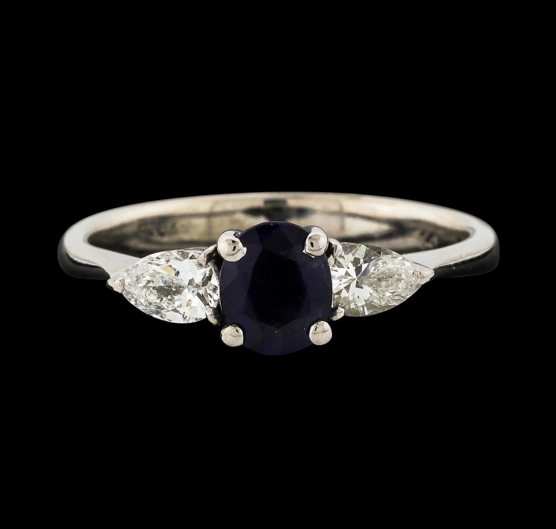 One electronically tested 14KT white gold lady's cast three stone straight line ring with a tapered cathedral shank with a bright polish finish. The featured lady's ring has a shank measuring 2.93 millimeters wide. Identified with markings of '14K'. Condition is like new, good workmanship. Containing: One prong set oval modified brilliant cut natural blue sapphire, measuring 5.92 x 4.93 x 2.75mm, (depth est.) approximate weight of 0.70ct., clarity is slightly included, medium dark, moderately strong, blue color, (GIA B 6/4), cut is good. Transmitting light with a minimum of distortion, transparent. Colored gemstones are presumed to have been subjected to commonly used enhancement processes. Minute abrasions on table and crown. Graded in the setting. Two prong set pear shaped cut diamonds, measuring 5.00 x 3.17 x 2.15mm (depth est.) approximate total weight of 2 Stones = 0.40ct. Graded in the setting. Clarity VS-2 to SI-1. Color: F - G Cut Very Good. Total Weight of Colored Stones 0.70ct.. Total Weight of Diamonds 0.40ct.. Total Weight of Ring 3.30gm GAS Appraised at $2,755.00.