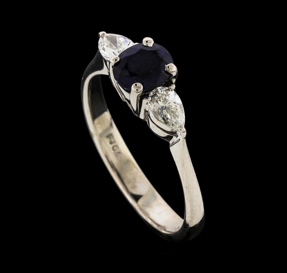 One electronically tested 14KT white gold lady's cast three stone straight line ring with a tapered cathedral shank with a bright polish finish. The featured lady's ring has a shank measuring 2.93 millimeters wide. Identified with markings of '14K'. Condition is like new, good workmanship. Containing: One prong set oval modified brilliant cut natural blue sapphire, measuring 5.92 x 4.93 x 2.75mm, (depth est.) approximate weight of 0.70ct., clarity is slightly included, medium dark, moderately strong, blue color, (GIA B 6/4), cut is good. Transmitting light with a minimum of distortion, transparent. Colored gemstones are presumed to have been subjected to commonly used enhancement processes. Minute abrasions on table and crown. Graded in the setting. Two prong set pear shaped cut diamonds, measuring 5.00 x 3.17 x 2.15mm (depth est.) approximate total weight of 2 Stones = 0.40ct. Graded in the setting. Clarity VS-2 to SI-1. Color: F - G Cut Very Good. Total Weight of Colored Stones 0.70ct.. Total Weight of Diamonds 0.40ct.. Total Weight of Ring 3.30gm GAS Appraised at $2,755.00.