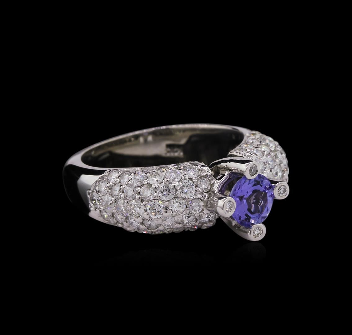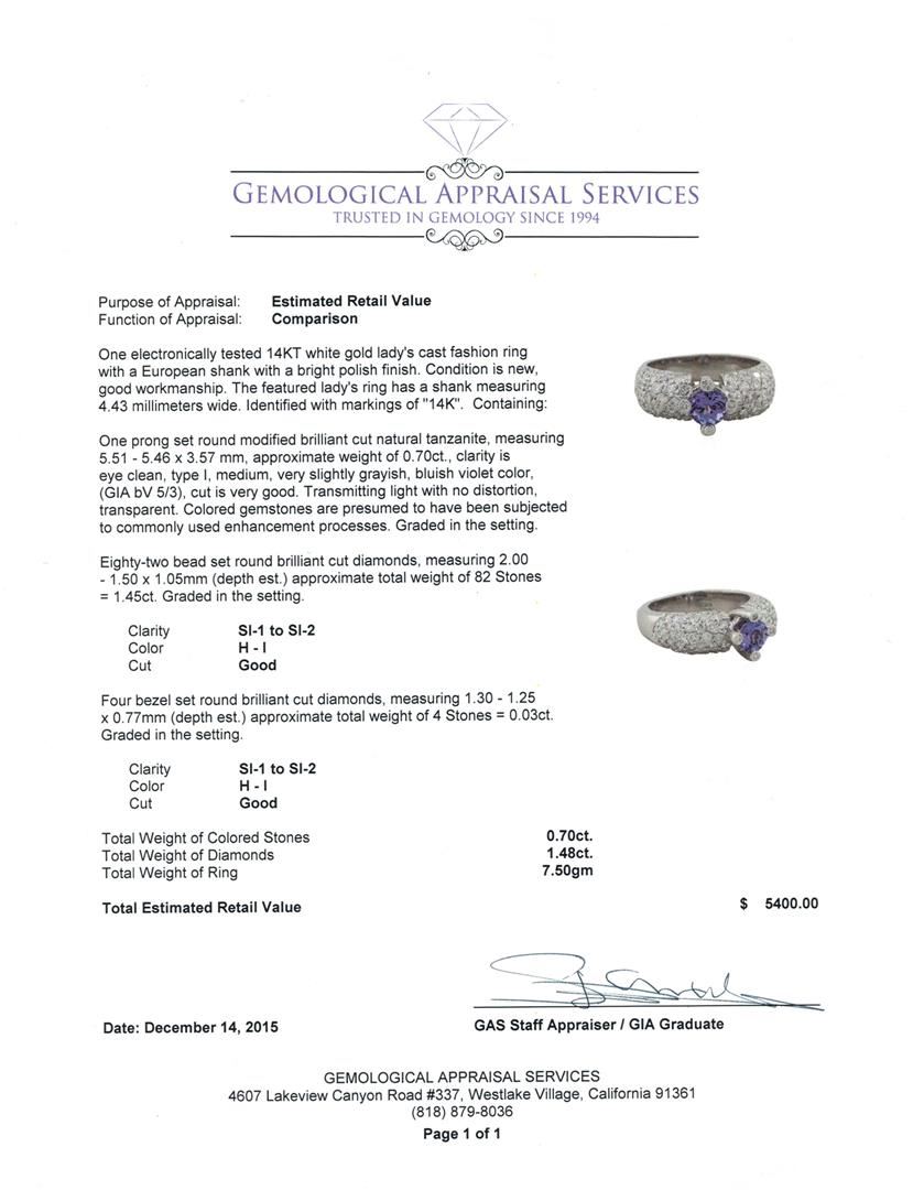 One electronically tested 14KT white gold lady's cast fashion ring with a European shank with a bright polish finish. The featured lady's ring has a shank measuring 4.43 millimeters wide. Identified with markings of "14K". Condition is new, good workmanship. Containing: One prong set round modified brilliant cut natural tanzanite, measuring 5.51 - 5.46 x 3.57 mm, approximate weight of 0.70ct., clarity is eye clean, type I, medium, very slightly grayish, bluish violet color, (GIA bV 5/3), cut is very good. Transmitting light with no distortion, transparent. Colored gemstones are presumed to have been subjected to commonly used enhancement processes. Graded in the setting. Eighty-Two bead set round brilliant cut diamonds, measuring 2.00 - 1.50 x 1.05mm (depth est.) approximate total weight of 82 Stones = 1.45ct. Graded in the setting. Clarity: SI-1 to SI-2. Color: H - I. Cut Good Four bezel set round brilliant cut diamonds, measuring 1.30 - 1.25 x 0.77mm (depth est.) approximate total weight of 4 Stones = 0.03ct. Graded in the setting. Clarity: SI-1 to SI-2. Color: H - I. Cut Good. Total Weight of Colored Stones 0.70ct. Total Weight of Diamonds 1.48ct. Total Weight of Ring 7.50gm. GAS Appraised at $5,400.00.
