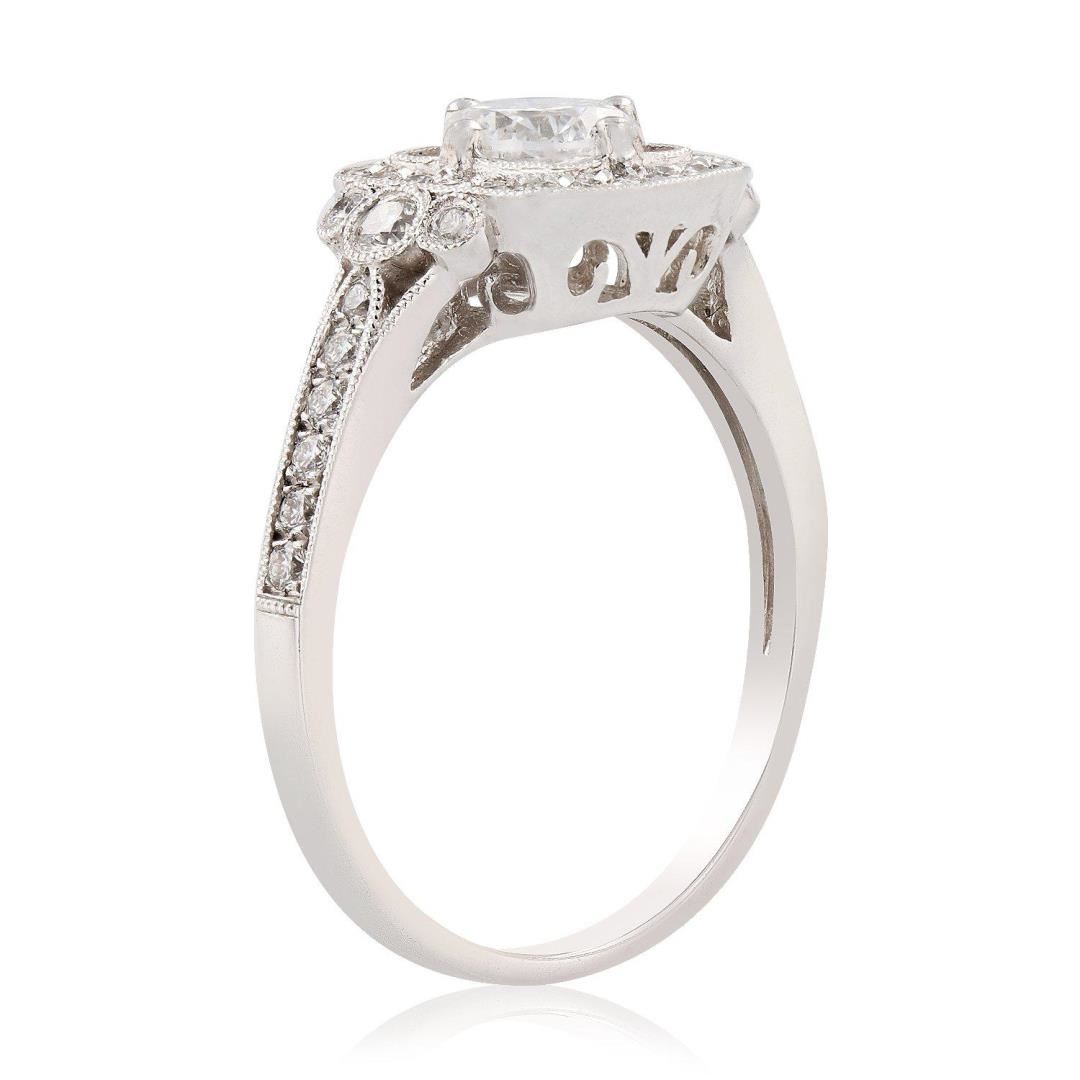One electronically tested platinum ladies cast diamond unity ring. Condition is new, good workmanship. The featured diamond is set within a diamond bezel, supported by diamond set shoulders, completed by a one and one-half millimeter wide band. Bright polish finish with milgrain detailing throughout. Trademark is Orianne. Identified with markings of "PT 950". Containing: One prong set round brilliant cut diamond, measuring 5.41 - 5.39 x 3.49mm, 10.00% GTCF exact weight 0.70ct. Graded loose in the GIA Laboratory, certificate #1182611010. The GIA Report is attached. Clarity VS-2 Color D Depth 64.6% Table 66.0% Pavil. Depth% 43.0% Crown Angle 35.0 Degrees Thirty-eight bead and bezel set round brilliant cut diamonds, measuring 2.00 - 1.30 x 0.99mm (depth est.) approximate total weight of 38 Stones = 0.35ct. Graded in the setting. Clarity VS-1 to VS-2 Color F - H Total Weight of Diamonds 1.05ct. Total Weight of Unity Ring 5.20 gm #LREF-8533