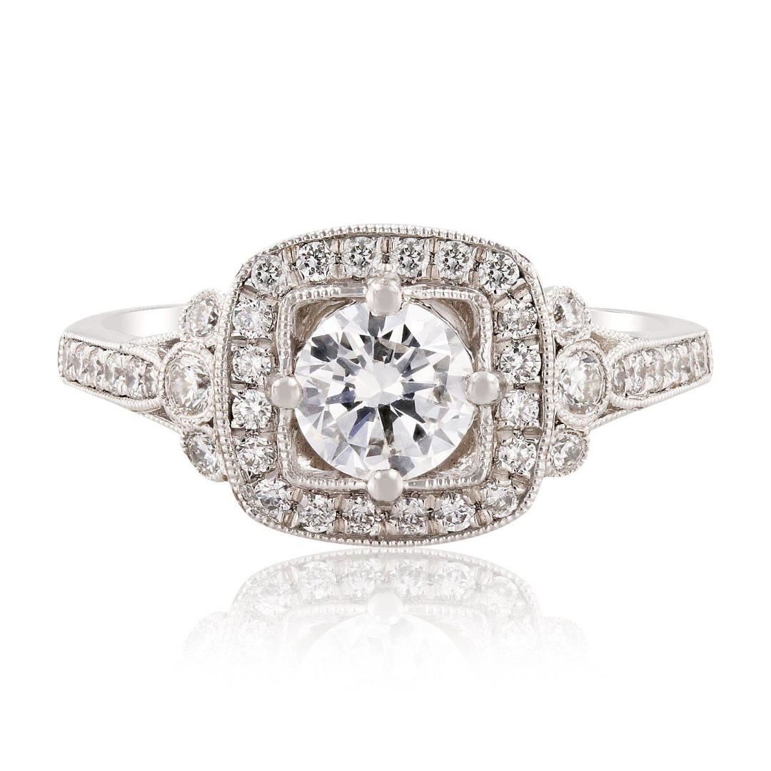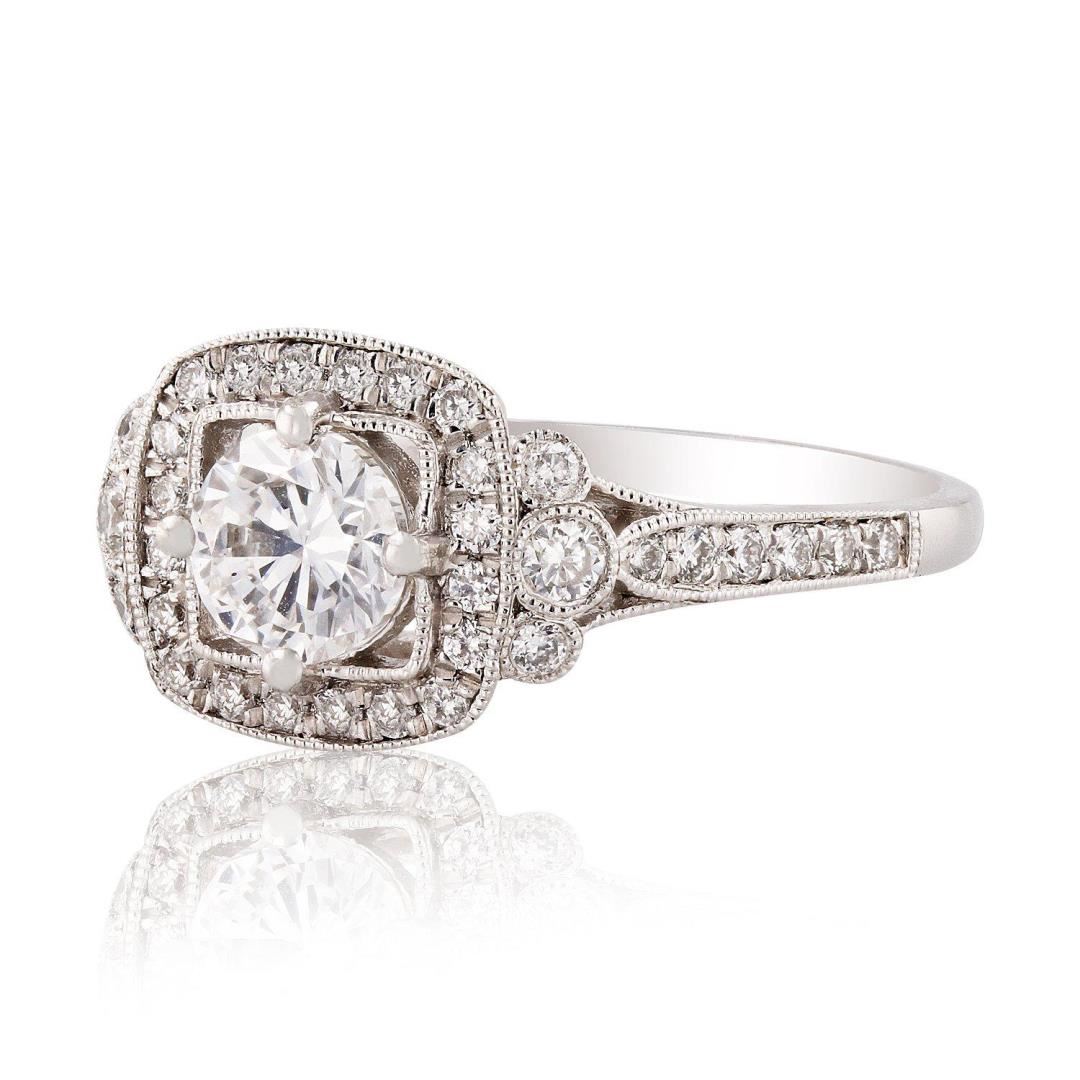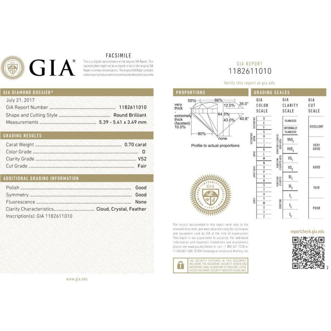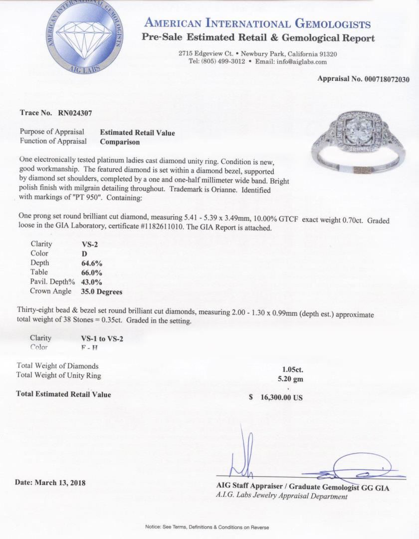 One electronically tested platinum ladies cast diamond unity ring. Condition is new, good workmanship. The featured diamond is set within a diamond bezel, supported by diamond set shoulders, completed by a one and one-half millimeter wide band. Bright polish finish with milgrain detailing throughout. Trademark is Orianne. Identified with markings of "PT 950". Containing: One prong set round brilliant cut diamond, measuring 5.41 - 5.39 x 3.49mm, 10.00% GTCF exact weight 0.70ct. Graded loose in the GIA Laboratory, certificate #1182611010. The GIA Report is attached. Clarity VS-2 Color D Depth 64.6% Table 66.0% Pavil. Depth% 43.0% Crown Angle 35.0 Degrees Thirty-eight bead and bezel set round brilliant cut diamonds, measuring 2.00 - 1.30 x 0.99mm (depth est.) approximate total weight of 38 Stones = 0.35ct. Graded in the setting. Clarity VS-1 to VS-2 Color F - H Total Weight of Diamonds 1.05ct. Total Weight of Unity Ring 5.20 gm Size: 7