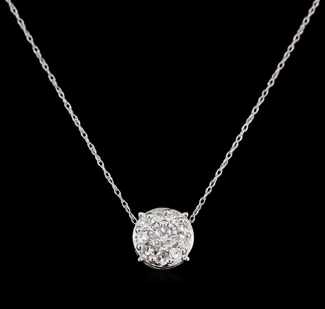One pendant with chain featuring: 14KT white gold weighing 1.90 grams containing one diamond center stone with a total weight of 0.40ct and diamond side stones with a total weight of 0.30ct.