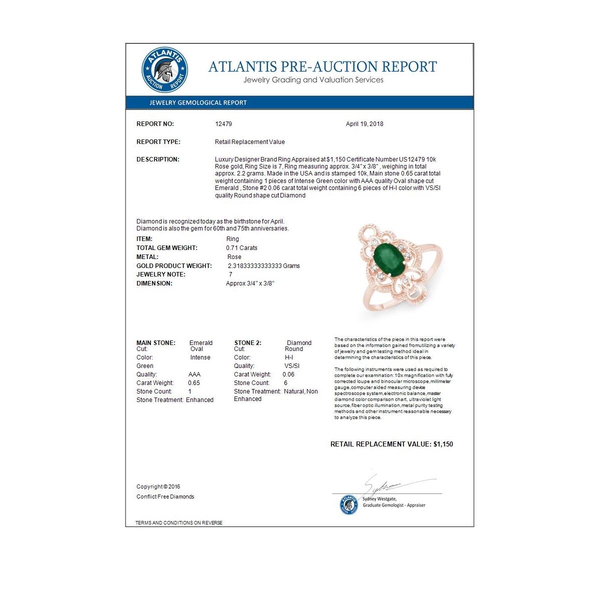 REF-17X5T -12479 ---- 0.71 CTW Emerald & Diamond Ring 10K Rose Gold ---- Luxury Designer Brand Ring Appraised at $1,150 Certificate Number US12479 10k Rose gold, Ring Size is 7, Ring measuring approx. 3/4" x 3/8" , weighing in total approx. 2.2 grams. Made in the USA and is stamped 10k, Main stone 0.65 carat total weight containing 1 pieces of Intense Green color with AAA quality Oval shape cut Emerald , Stone #2 0.06 carat total weight containing 6 pieces of H-I color with VS/SI quality Round shape cut Diamond