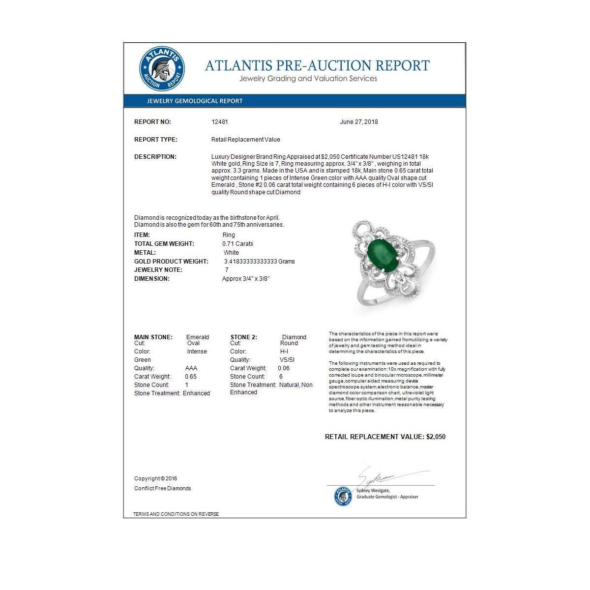 REF-30W8F -12481 ---- 0.71 CTW Emerald & Diamond Ring 18K White Gold ---- Luxury Designer Brand Ring Appraised at $2,050 Certificate Number US12481 18k White gold, Ring Size is 7, Ring measuring approx. 3/4" x 3/8" , weighing in total approx. 3.3 grams. Made in the USA and is stamped 18k, Main stone 0.65 carat total weight containing 1 pieces of Intense Green color with AAA quality Oval shape cut Emerald , Stone #2 0.06 carat total weight containing 6 pieces of H-I color with VS/SI quality Round shape cut Diamond