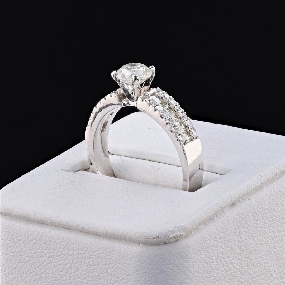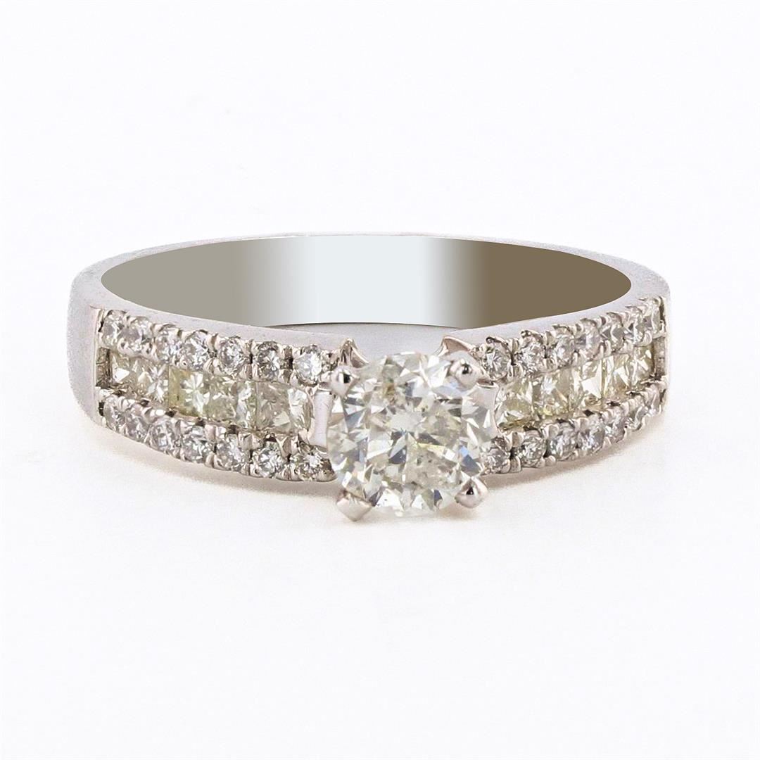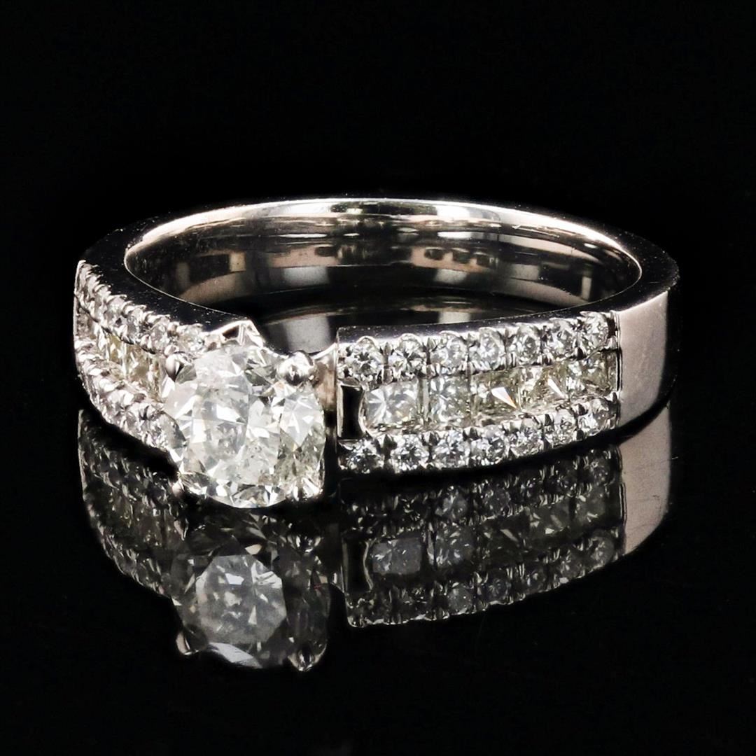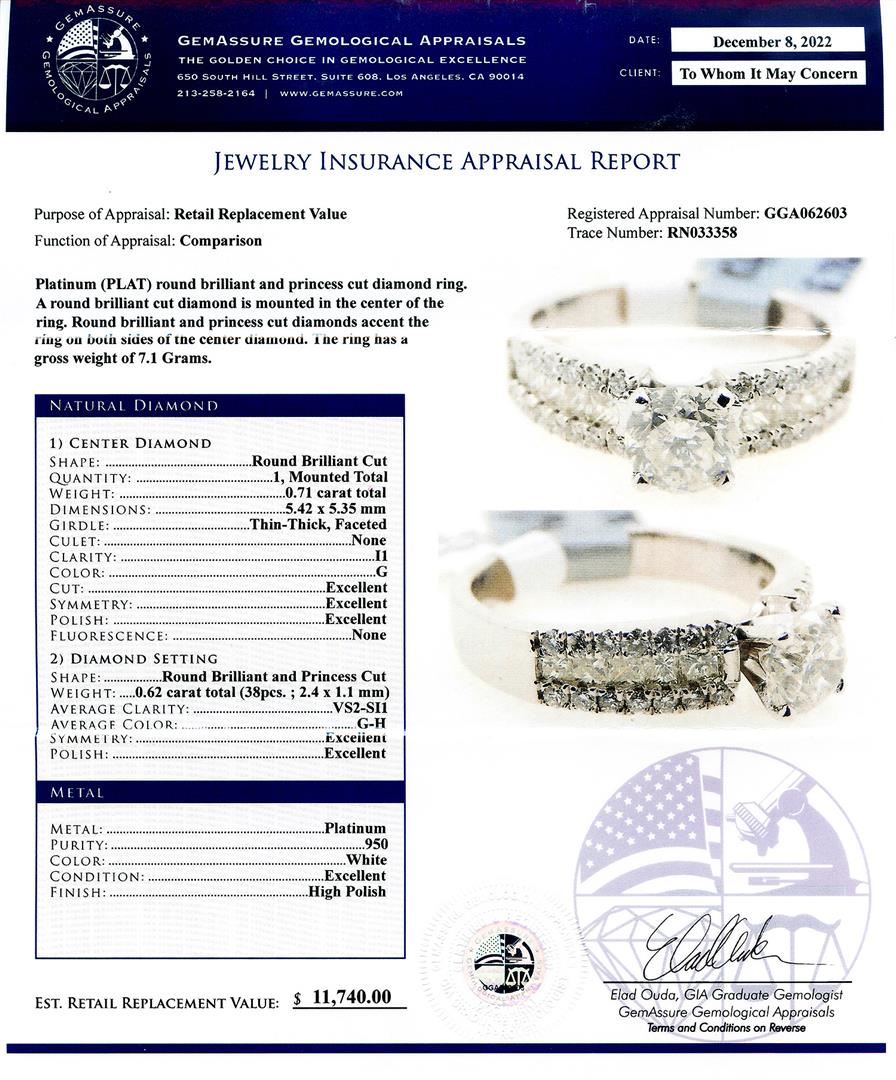 Platinum (PLAT) round brilliant and princess cut diamond ring. A round brilliant cut diamond is mounted in the center of the ring. Round brilliant and princess cut diamonds accent the ring on both sides of the center diamond. The ring has a gross weight o