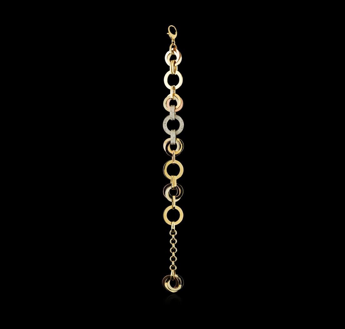 One electronically tested 14KT yellow, white, and rose gold lady's combination cast & assembled fashion bracelet with a lobster claw clasp with a bright polish finish. The featured lady's bracelet is adjustable and can be worn between 6.5 and 7.5 inches in length. Identified with markings of "K14". Condition is new, good workmanship. Containing: Forty-Four prong set round brilliant cut diamonds, measuring 1.30 - 1.20 x 0.78mm (depth est.) approximate total weight of 44 Stones = 0.33ct. Graded in the setting. Clarity: SI-1 to I-1. Color: H - I. Cut Good Seventy-Six prong set round brilliant cut diamonds, measuring 1.15 - 1.05 x 0.68mm (depth est.) approximate total weight of 76 Stones = 0.38ct. Graded in the setting. Clarity: SI-1 to I-1. Color: H - I. Cut Good. Total Weight of Diamonds 0.71ct. Total Weight of Bracelet 21.40gm GAS Appraised at $6,230.00.