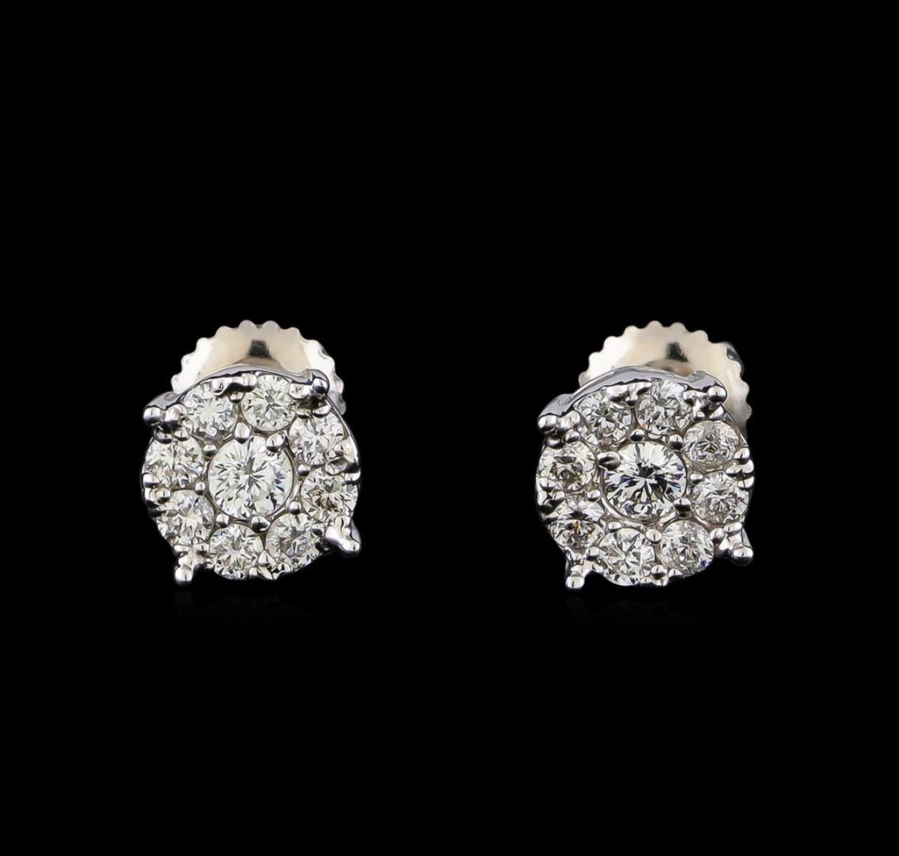 One pair electronically tested 14KT white gold cast & assembled diamond earrings with screw backs. Each earring features an organized diamond cluster and supported by a lattice under gallery. Bright polish finish. Condition is new, good workmanship. Containing: Two prong set round brilliant cut diamonds, measuring 2.85 - 2.80 x 1.70mm (depth est.) approximate total weight of 2 Stones = 0.18ct. Graded in the setting. Clarity: SI-1. Color: G - H Sixteen prong set round brilliant cut diamonds, measuring 2.00 - 1.90 x 1.17mm (depth est.) approximate total weight of 16 Stones = 0.53ct. Graded in the setting. Clarity: VS-2 to SI-2. Color: G - I. Total Weight of Diamonds 0.71ct. Total Weight of Earrings 2.26gm. AIG Appraised at $2,645.00.