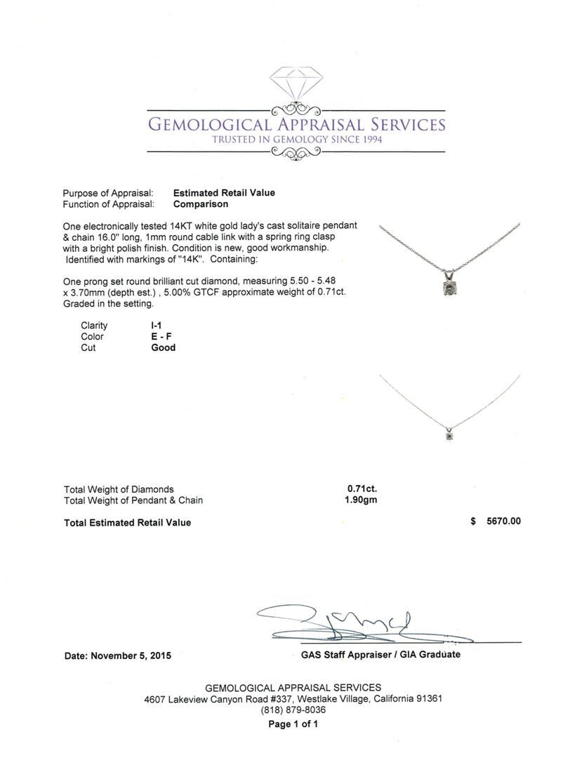 One electronically tested 14KT white gold lady's cast solitaire pendant & chain 16.0" long, 1mm round cable link with a spring ring clasp with a bright polish finish. Identified with markings of "14K". Condition is new, good workmanship. Containing: One prong set round brilliant cut diamond, measuring 5.50 - 5.48 x 3.70mm (depth est.) , 5.00% GTCF approximate weight of 0.71ct. Graded in the setting. Clarity: I-1. Color: E - Good. Total Weight of Diamonds 0.71ct. Total Weight of Pendant & Chain 1.90gm GAS Appraised at $5,670.00.