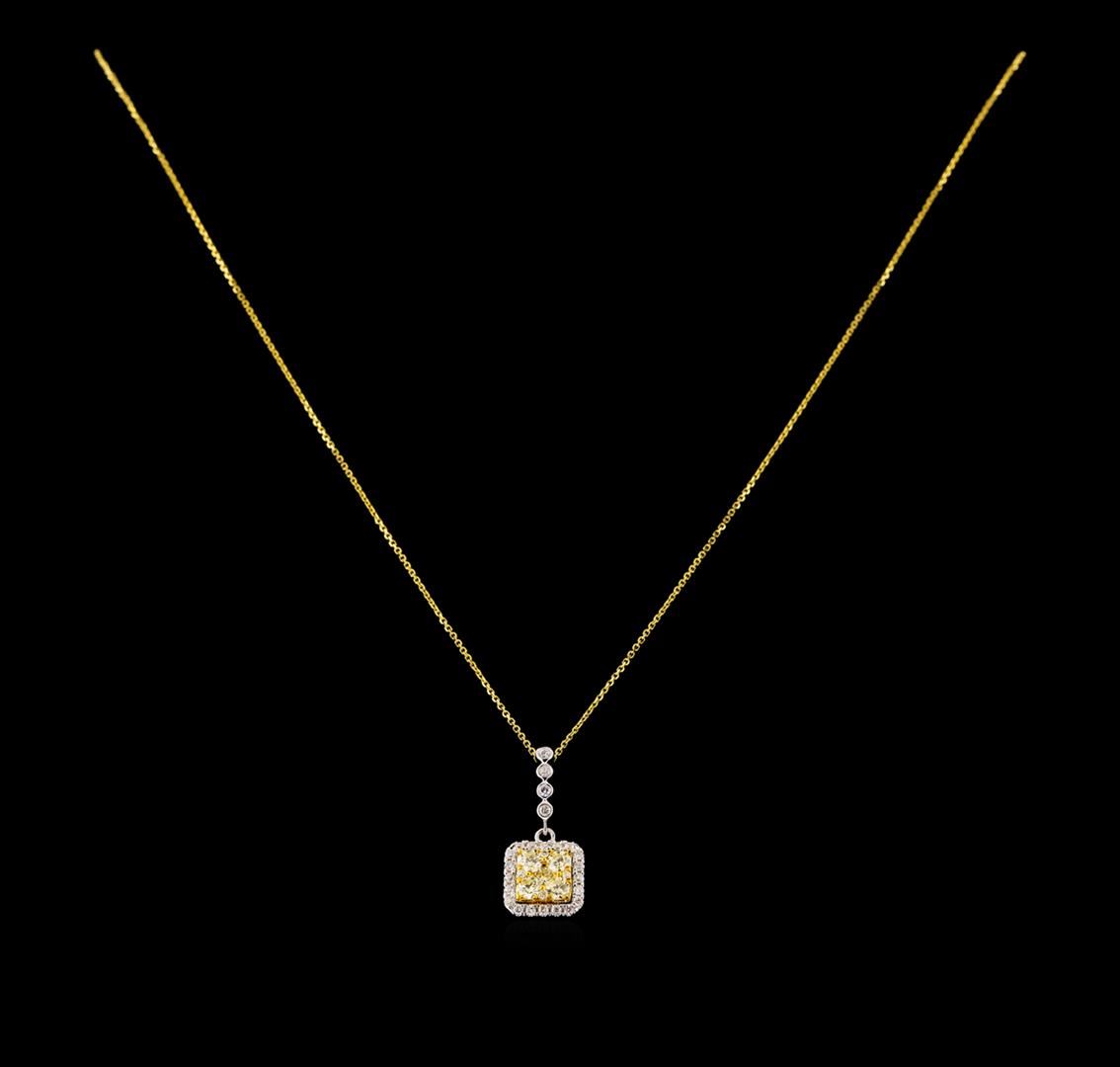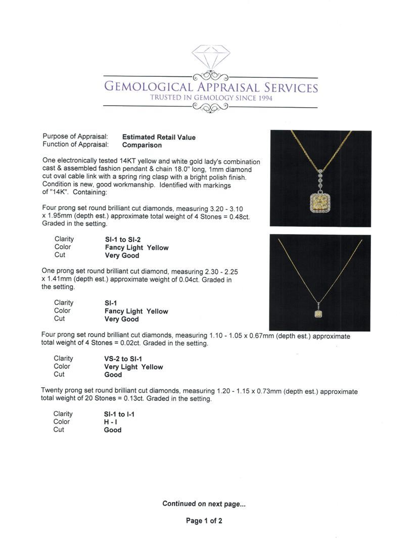 One electronically tested 14KT yellow and white gold lady's combination cast & assembled fashion pendant & chain 18.0' long, 1mm diamond cut oval cable link with a spring ring clasp with a bright polish finish. Identified with markings of '14K'. Condition is new, good workmanship. Containing: Four prong set round brilliant cut diamonds, measuring 3.20 - 3.10 x 1.95mm (depth est.) approximate total weight of 4 Stones = 0.48ct. Graded in the setting. Clarity SI-1 to SI-2 Cut Very Good One prong set round brilliant cut diamond, measuring 2.30 - 2.25 x 1.41mm (depth est.) approximate weight of 0.04ct. Graded in the setting. Clarity SI-1 Cut Very Good Four prong set round brilliant cut diamonds, measuring 1.10 - 1.05 x 0.67mm (depth est.) approximate total weight of 4 Stones = 0.02ct. Graded in the setting. Clarity VS-2 to SI-1 Cut Good Twenty prong set round brilliant cut diamonds, measuring 1.20 - 1.15 x 0.73mm (depth est.) approximate total weight of 20 Stones = 0.13ct. Graded in the setting. Clarity SI-1 to I-1. Color: H - I Cut Good Four bezel set round brilliant cut diamonds, measuring 1.40 - 1.35 x 0.86mm (depth est.) approximate total weight of 4 Stones = 0.04ct. Graded in the setting. Clarity SI-1 to SI-2. Color: G - H Cut Good. Total Weight of Diamonds 0.71ct.. Total Weight of Pendant & Chain 2.80gm. GAS Appraised at $3,390.00.
