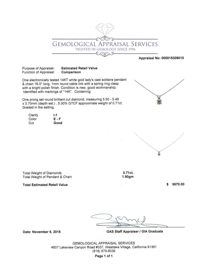One electronically tested 14KT white gold lady's cast solitaire pendant & chain 16.0" long, 1mm round cable link with a spring ring clasp with a bright polish finish. Identified with markings of "14K". Condition is new, good workmanship. Containing: One prong set round brilliant cut diamond, measuring 5.50 - 5.48 x 3.70mm (depth est.) , 5.00% GTCF approximate weight of 0.71ct. Graded in the setting. Clarity: I-1. Color: E - Good. Total Weight of Diamonds 0.71ct. Total Weight of Pendant & Chain 1.90gm GAS Appraised at $5,670.00.