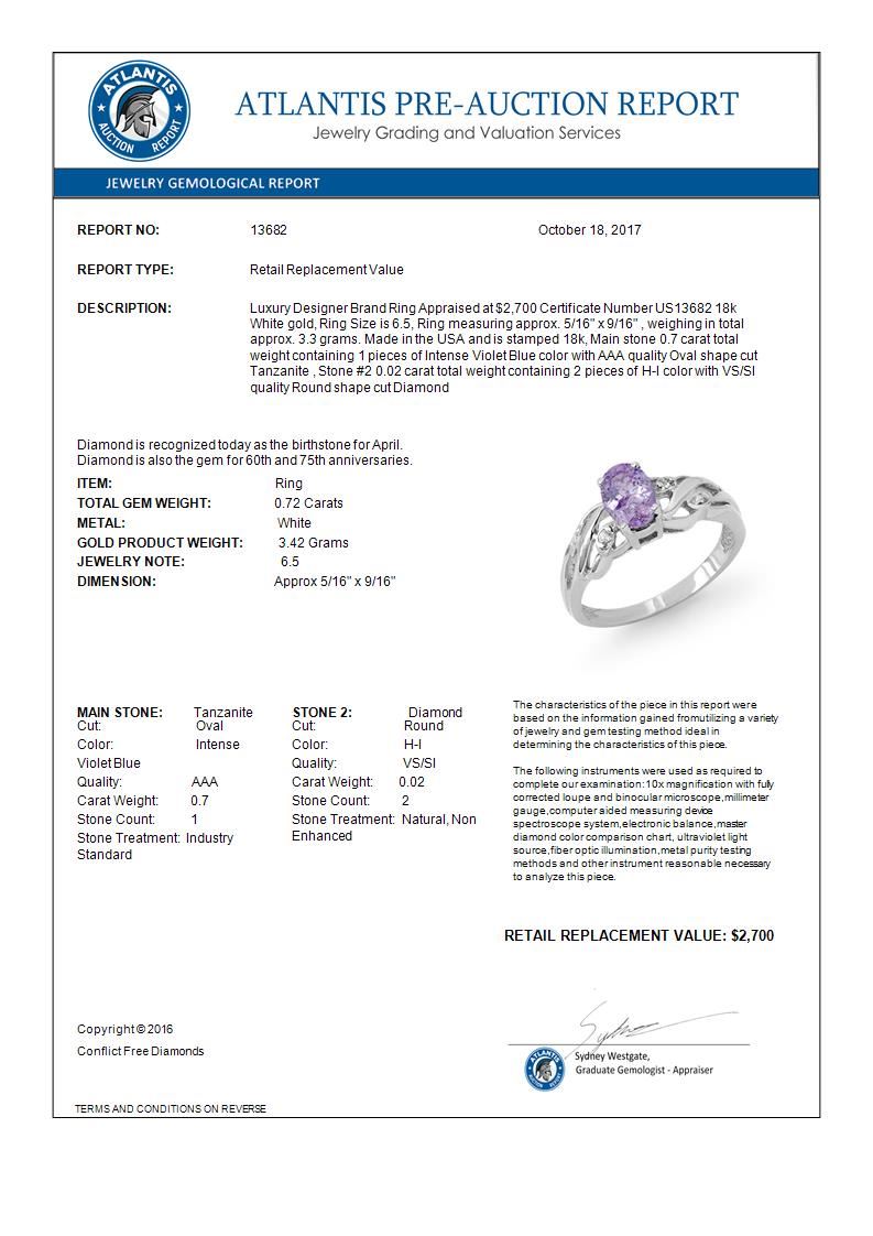13682 - REF-37M8F ---- 0.72 CTW Tanzanite & Diamond Ring 18K White Gold ---- Luxury Designer Brand Ring Appraised at $2,700 Certificate Number US13682 18k White gold, Ring Size is 6.5, Ring measuring approx. 5/16" x 9/16" , weighing in total approx. 3.3 grams. Made in the USA and is stamped 18k, Main stone 0.7 carat total weight containing 1 pieces of Intense Violet Blue color with AAA quality Oval shape cut Tanzanite , Stone #2 0.02 carat total weight containing 2 pieces of H-I color with VS/SI quality Round shape cut Diamond